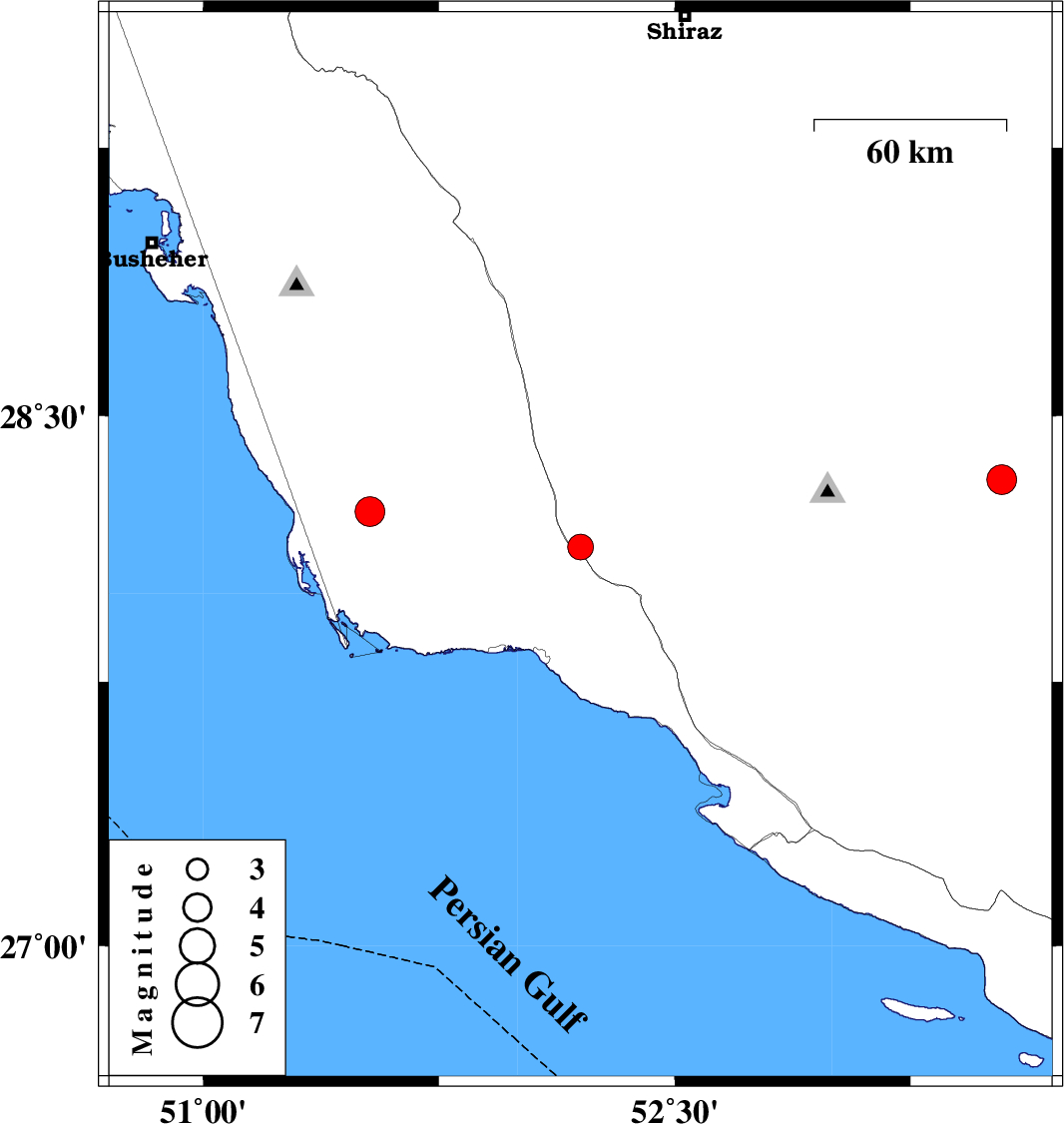 2008/11/28 | 20:16:31.8 | 23:46:31.8 | 28.23 | 51.53 | 15 | ML:4.2 | 49 km South-East of Khormog, Bushehr Province | ||