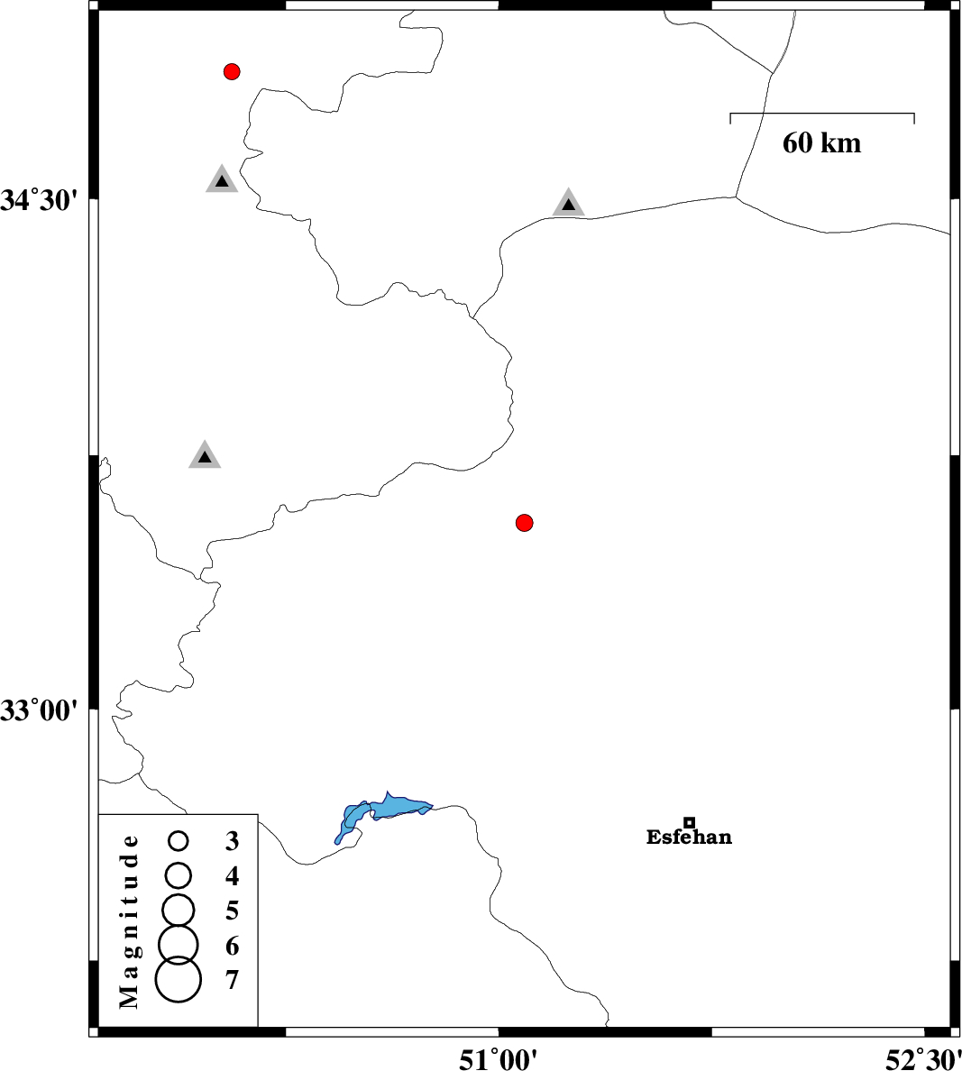 2008/12/19 | 07:26:36.8 | 10:56:36.8 | 33.55 | 51.09 | 14 | ML:2.7 | 58 km South-West of Kashan, Esfahan Province | ||