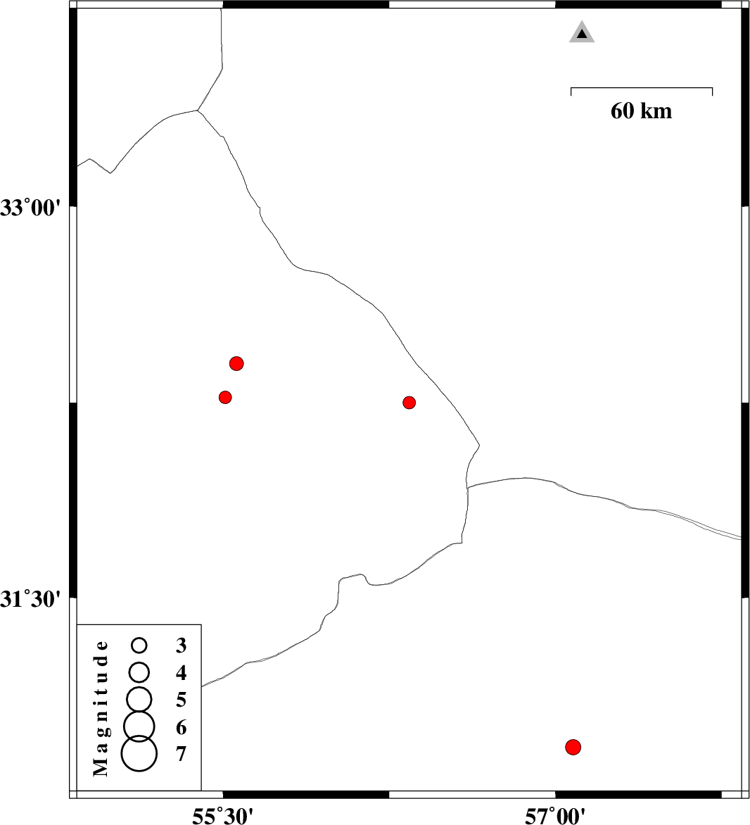 2008/12/15 | 13:18:30.5 | 16:48:30.5 | 32.27 | 55.51 | 14 | ML:2.5 | 74 km North-East of Bafq, Yazd Province |