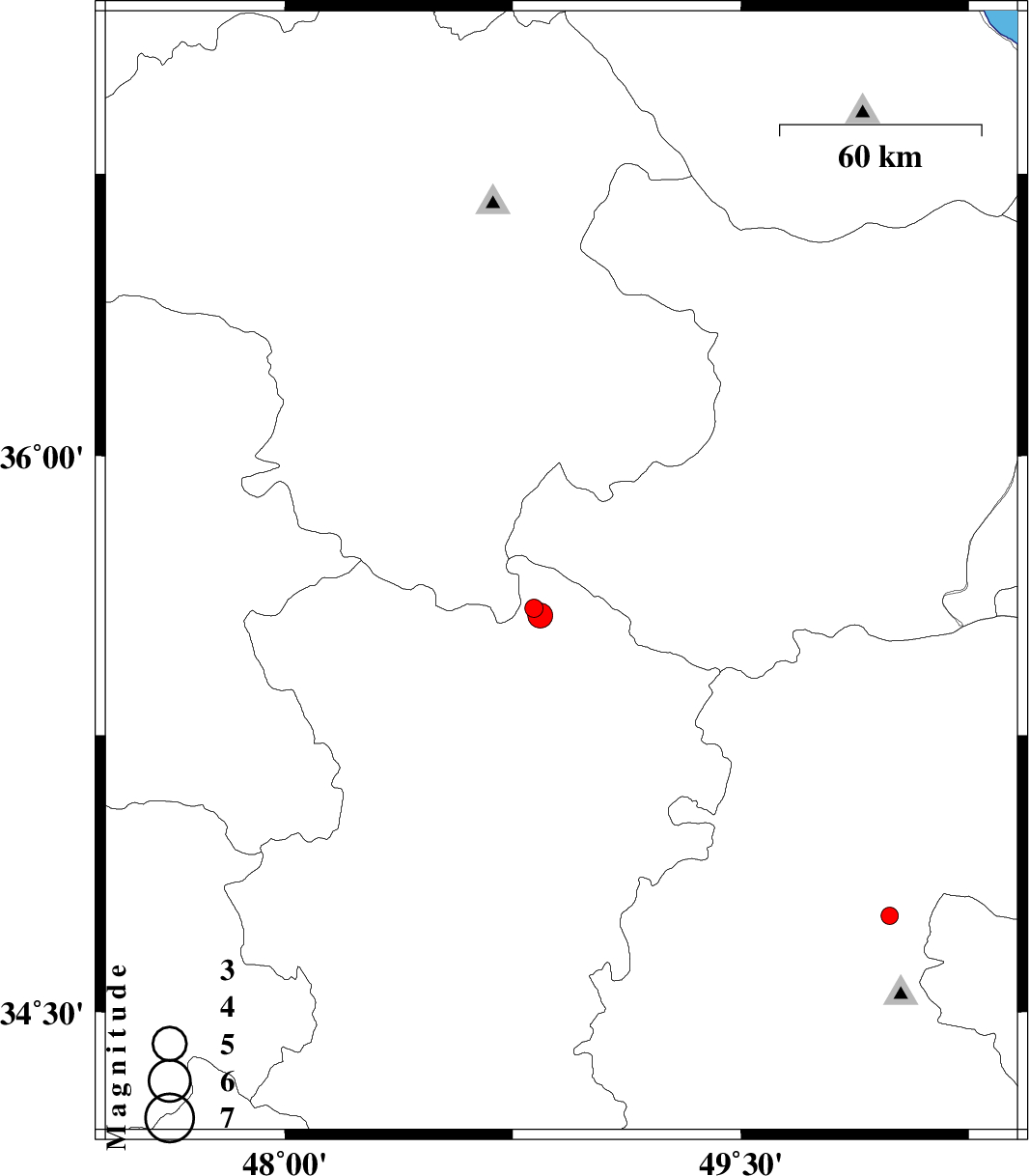 2009/01/01 | 00:45:24.3 | 04:15:24.3 | 35.68 | 48.91 | 14 | ML:3.6 | 34 km North-West of Razan, Hamedan Province | ||