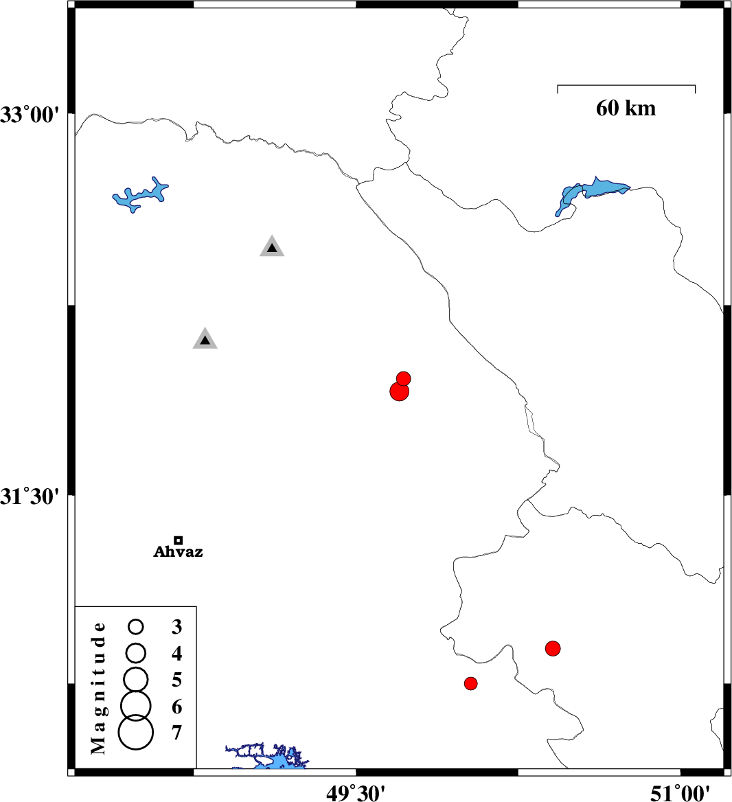 2009/01/07 | 01:19:01.3 | 04:49:01.3 | 31.91 | 49.7 | 45 | ML:4 | 17 km West of Izeh, Khoozestan Province | ||