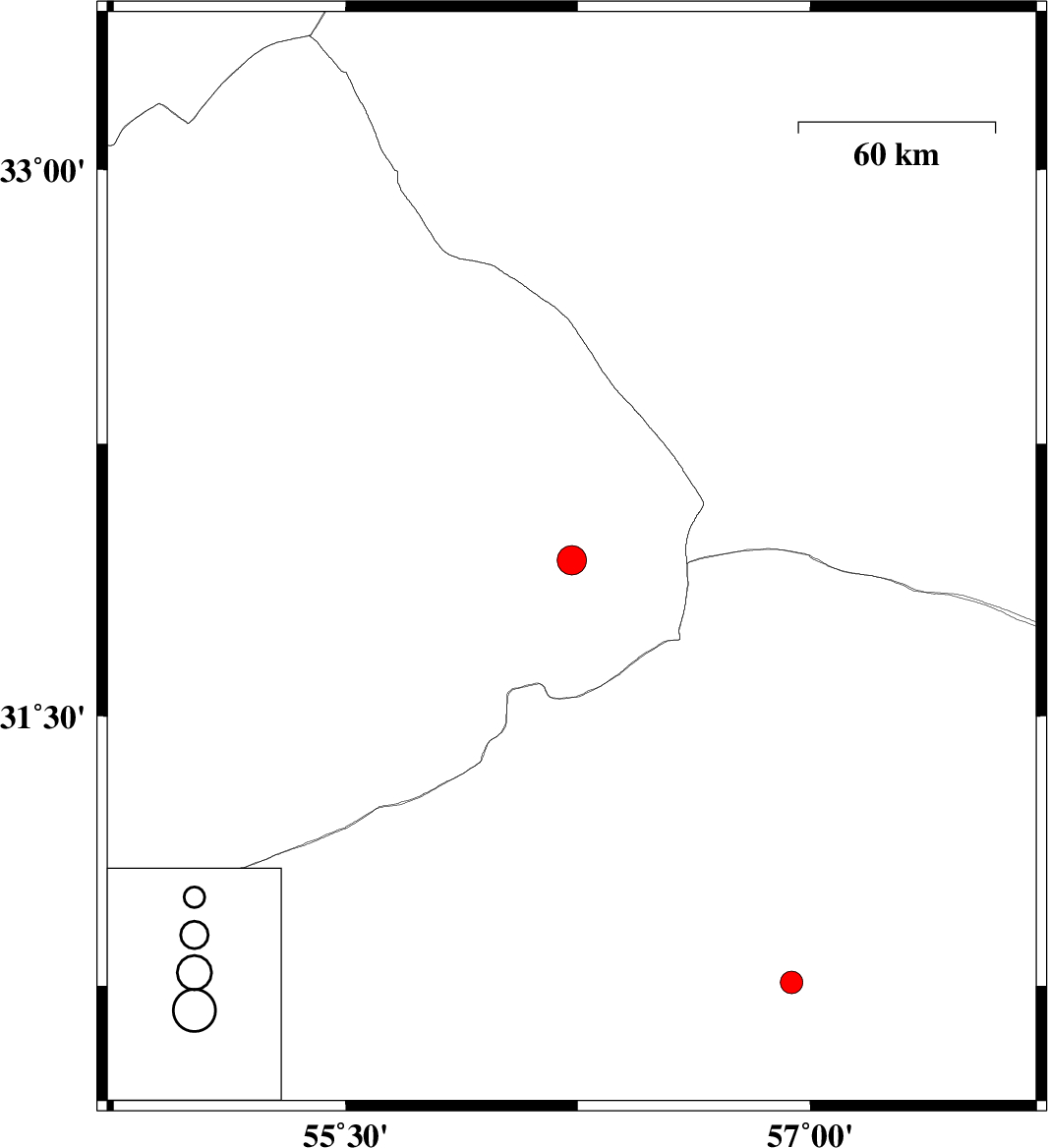 2009/01/01 | 09:51:40.1 | 13:21:40.1 | 30.76 | 56.94 | 14 | ML:3.2 | 35 km East of Zarand, Kerman Province |