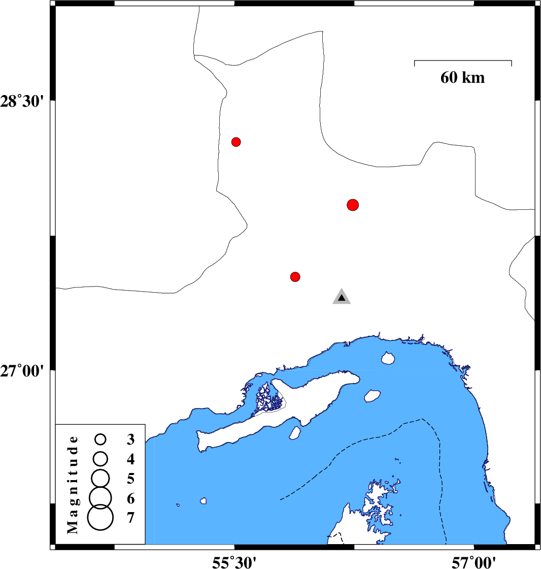 2009/01/14 | 13:13:54.5 | 16:43:54.5 | 27.92 | 56.24 | 14 | ML:3.2 | 54 km South-East of Hajiabad, Hormozgan Province | ||