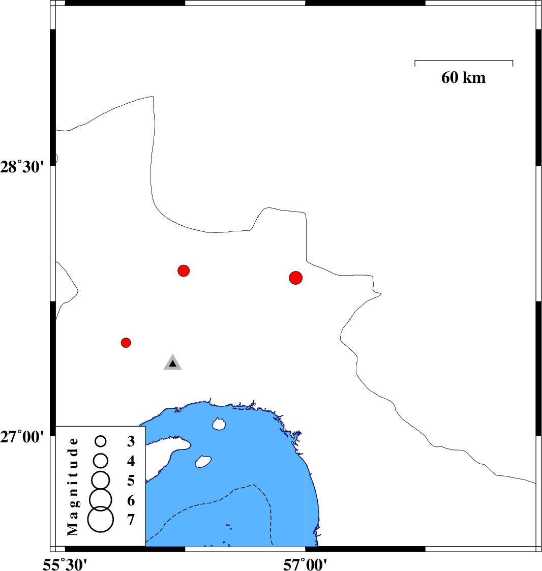 2009/01/17 | 08:41:54.6 | 12:11:54.6 | 27.52 | 55.88 | 14 | ML:2.7 | 54 km North-West of Bandar-e abbas, Hormozgan Province | ||