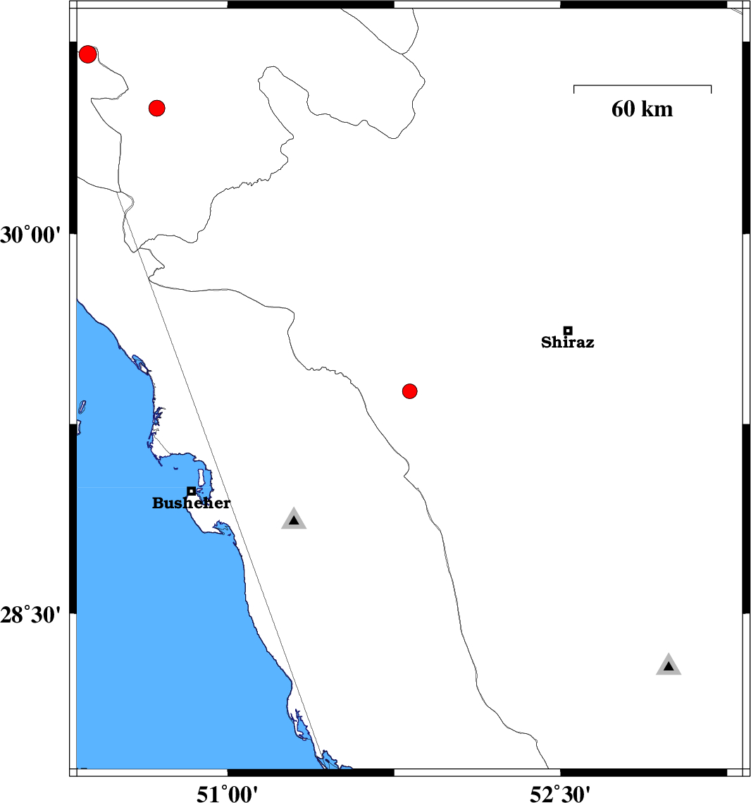 2009/01/29 | 23:50:32.3 | 03:20:32.3 | 29.38 | 51.82 | 18 | ML:3 | 31 km South-East of Kazerun, Fars Province | ||