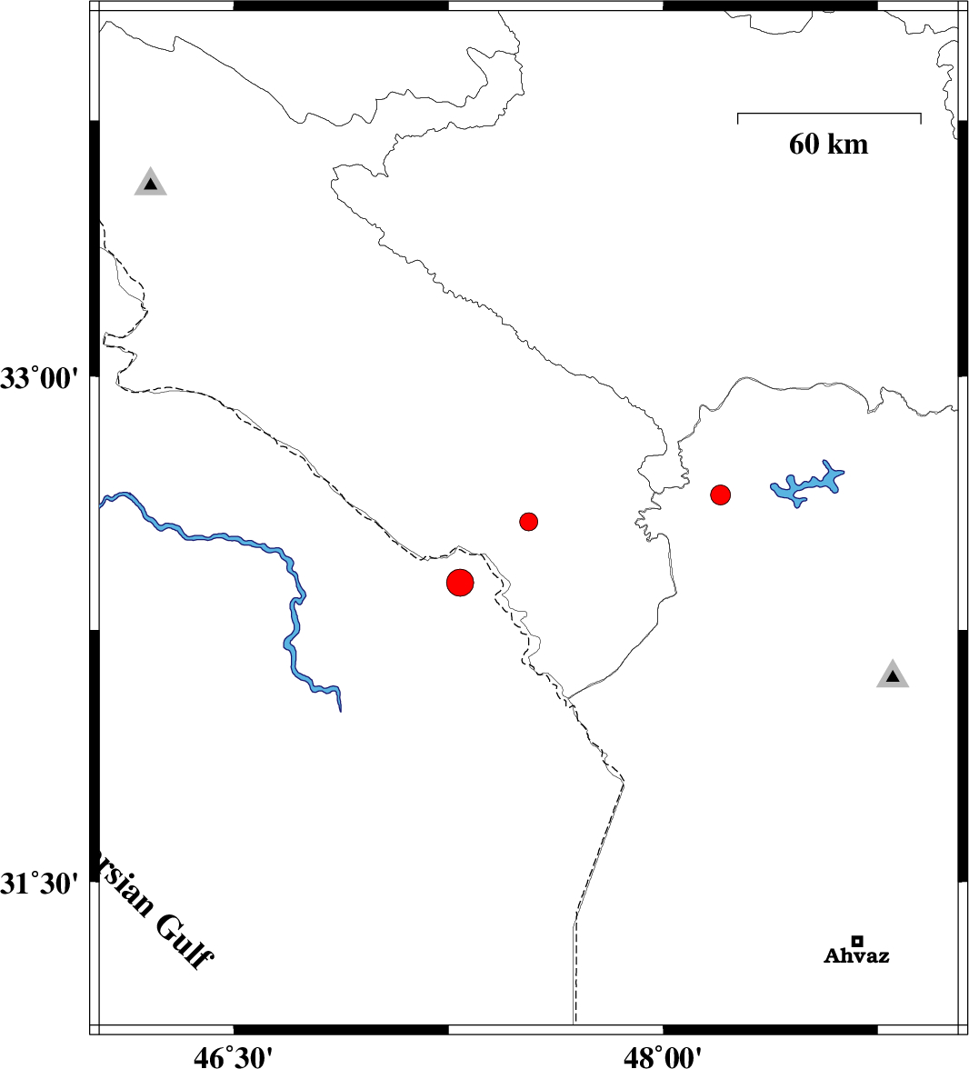2009/02/02 | 03:10:21.4 | 06:40:21.4 | 32.57 | 47.53 | 14 | ML:2.8 | 28 km South-East of Dehloran, Ilam Province | ||