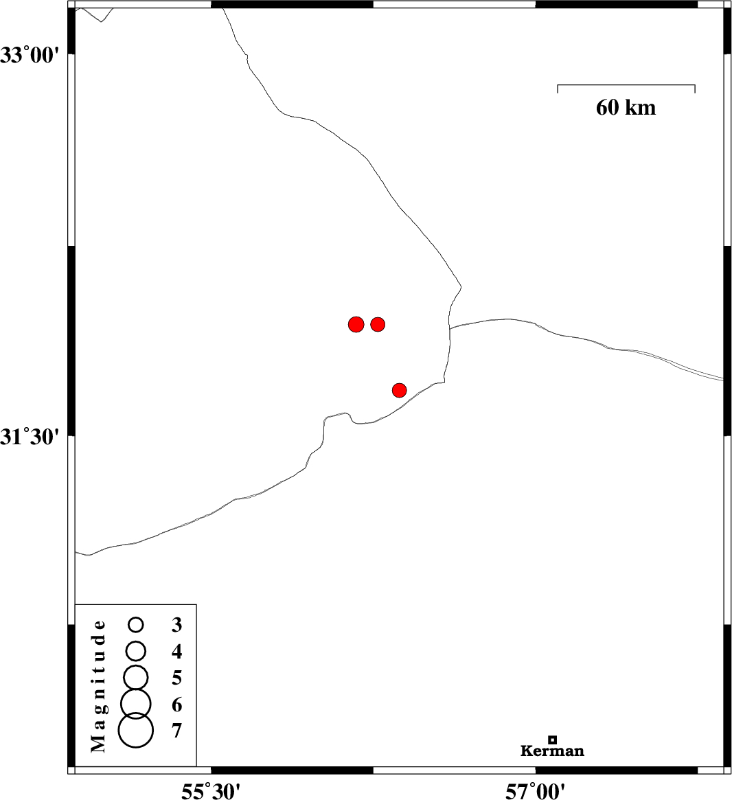 2009/02/05 | 15:45:16.7 | 19:15:16.7 | 31.68 | 56.37 | 14 | ML:2.9 | 62 km North-West of Ravar, Kerman Province | ||