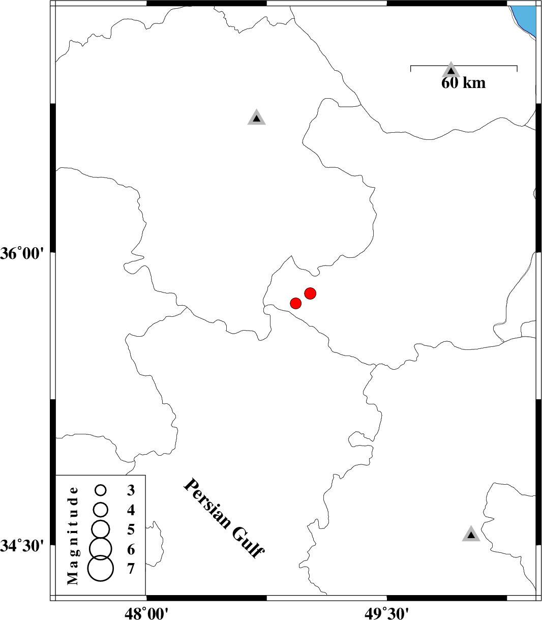 2009/02/05 | 23:44:46.4 | 03:14:46.4 | 35.74 | 48.93 | 16 | ML:3.1 | 40 km North-West of Razan, Hamedan Province | ||