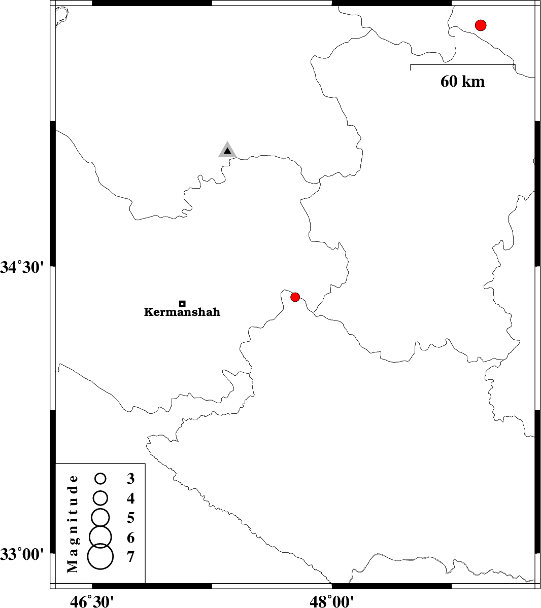 2009/02/12 | 11:04:20.4 | 14:34:20.4 | 34.34 | 47.77 | 18 | ML:2.5 | 17 km South of Sahneh, Kermanshah Province | ||