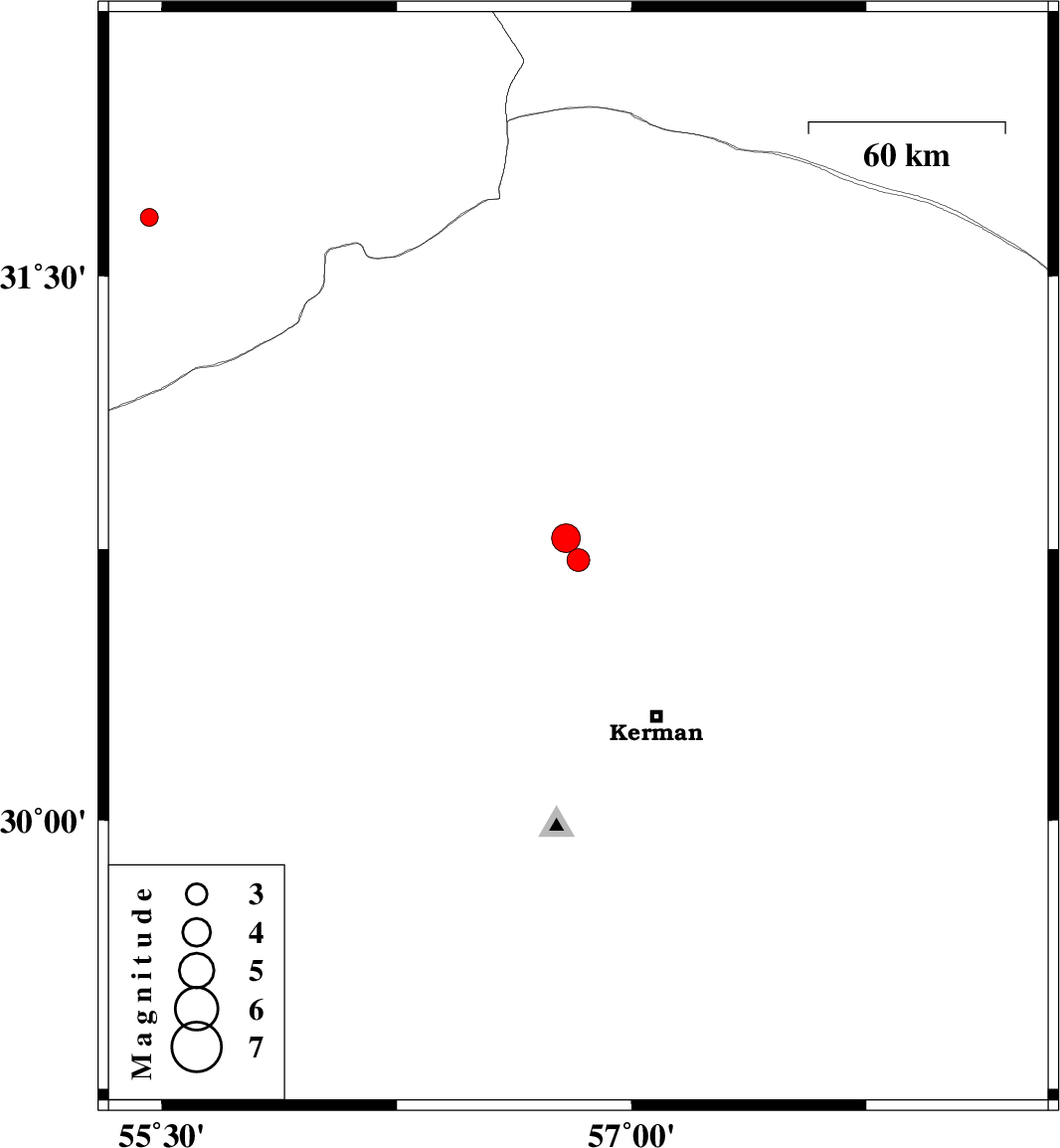 2009/03/07 | 06:47:07.6 | 10:17:07.6 | 30.78 | 56.79 | 8 | ML:4.1 | 21 km East of Zarand, Kerman Province |