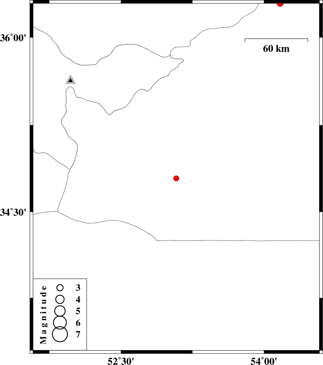 2009/03/17 | 10:32:23.5 | 14:02:23.5 | 34.79 | 53.08 | 47 | ML:2.6 | 82 km South-East of Garmsar, Semnan Province | ||