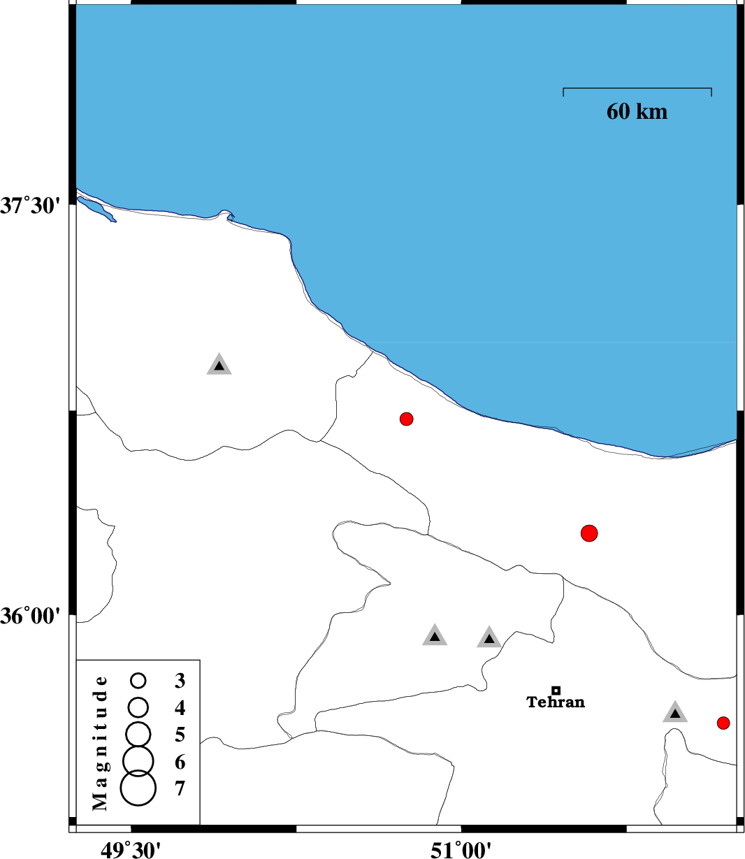 2009/03/19 | 18:45:39.7 | 22:15:39.7 | 35.6 | 52.19 | 14 | ML:2.6 | 16 km South-East of Damavand, Tehran Province | ||