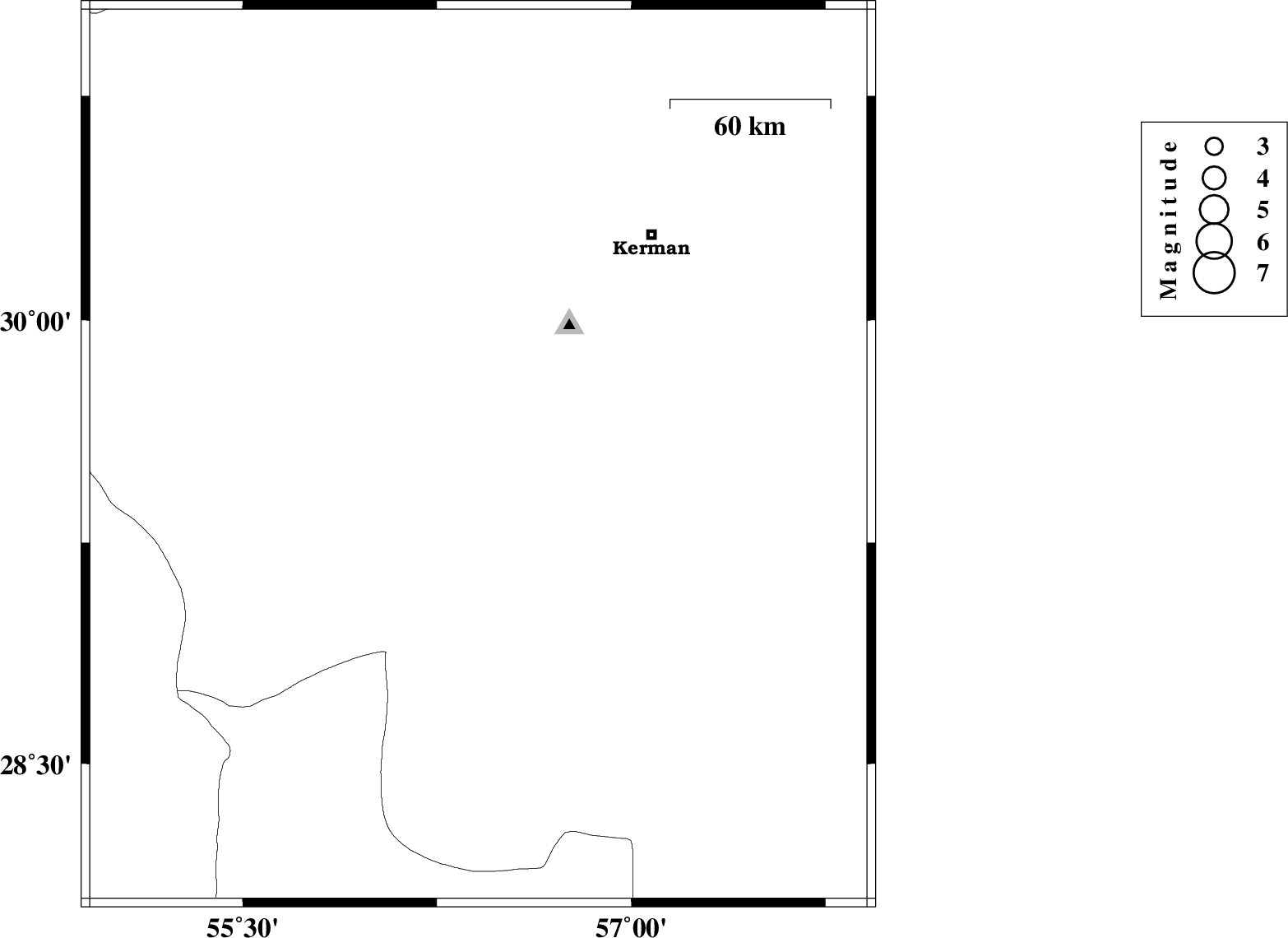 2009/03/03 | 03:59:50.8 | 07:29:50.8 | 28.16 | 57.26 | 14 | ML:4.2 | 47 km North-West of Kahnuj, Kerman Province |