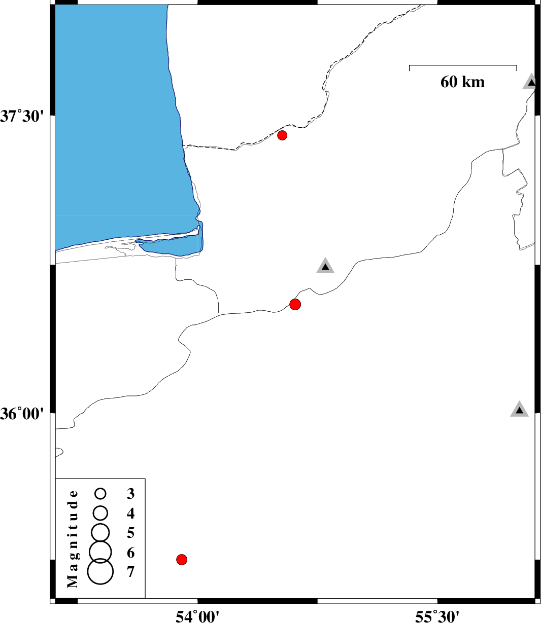 2009/03/26 | 07:05:56.7 | 11:35:56.7 | 37.4 | 54.53 | 15 | ML:2.7 | 43 km North of Aq Qaleh, Golestan Province | ||