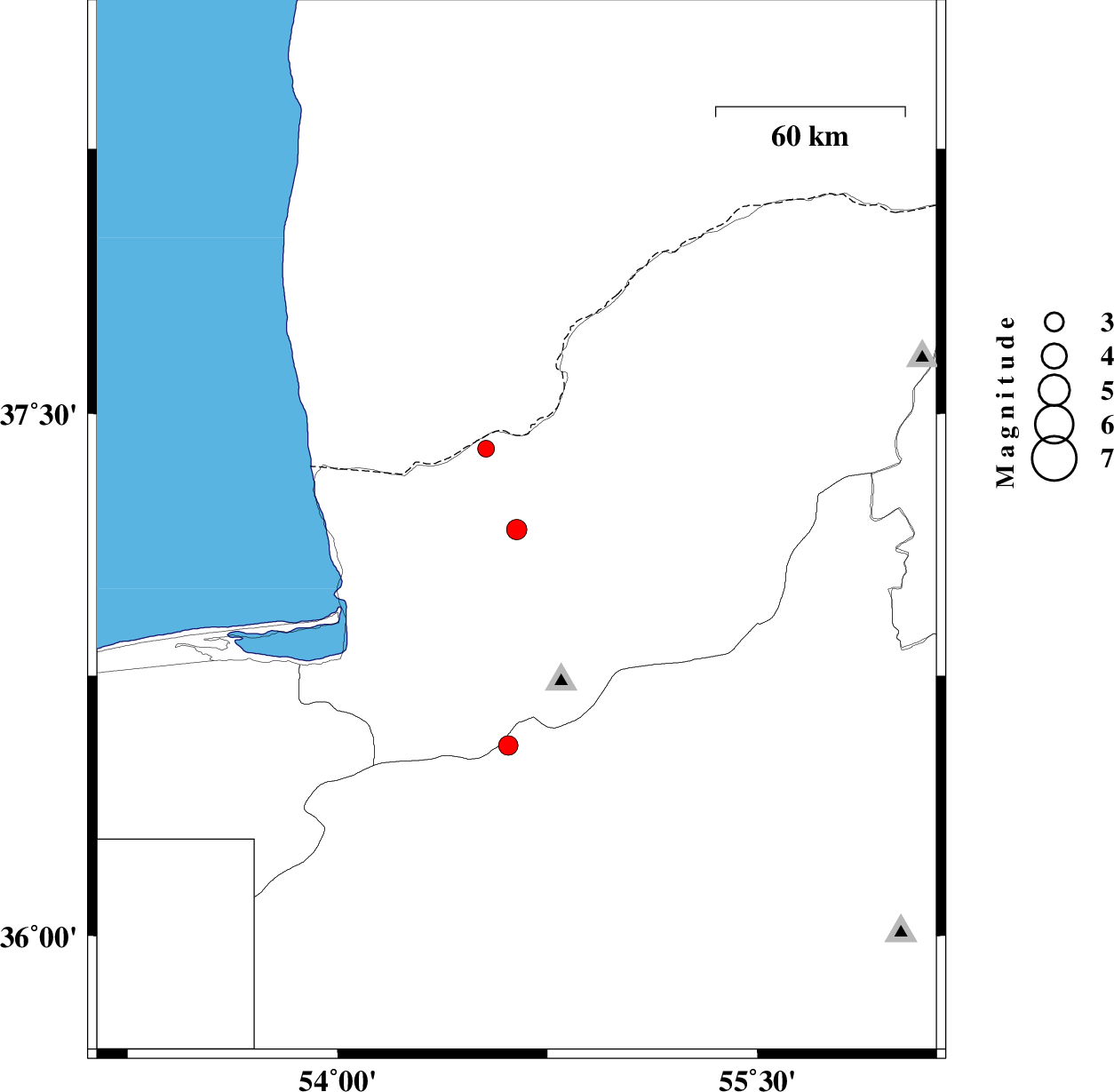 | 2009/03/26 | 07:05:56.7 | 11:35:56.7 | 37.4 | 54.53 | 15 | ML:2.7 | 43 km North of Aq Qaleh, Golestan Province |