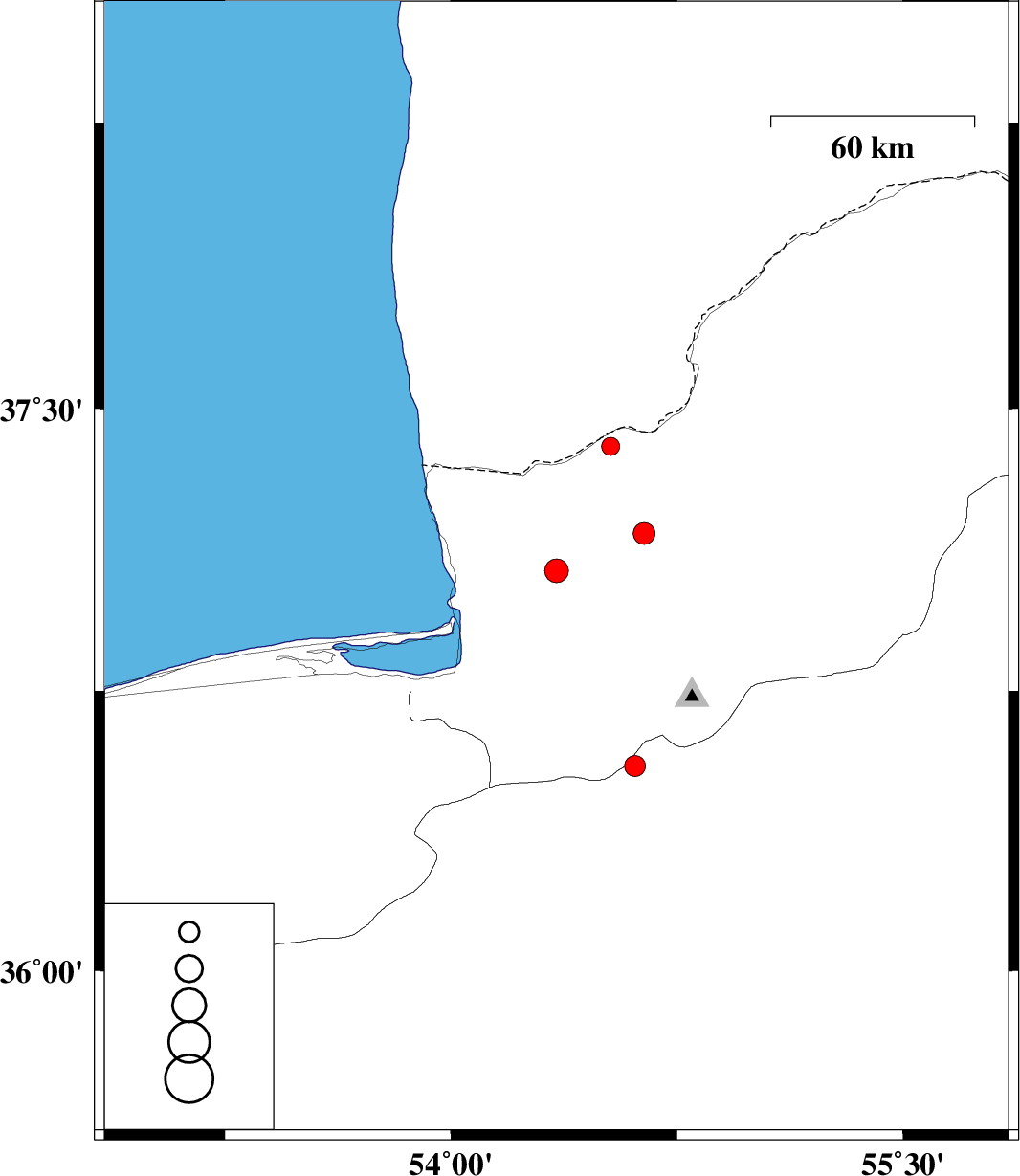 2009/03/26 | 07:05:56.7 | 11:35:56.7 | 37.4 | 54.53 | 15 | ML:2.7 | 43 km North of Aq Qaleh, Golestan Province |