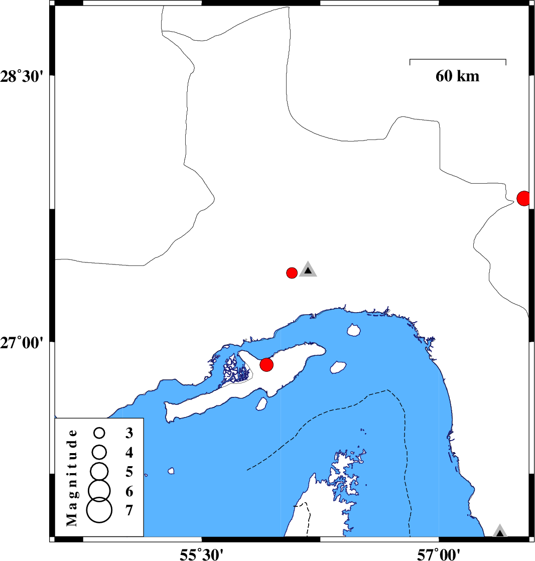 2009/04/14 | 05:10:26.6 | 09:40:26.6 | 26.87 | 55.91 | 8 | ML:3.8 | Persian Gulf, 36 km West of Qeshm | ||