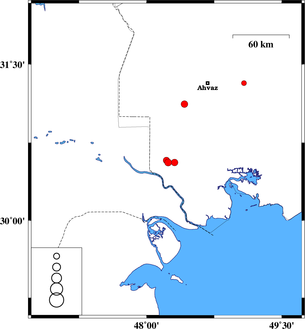 2009/04/22 21:46:14.5 02:16:14.5 31.1248.4214 ML:3.4 32 km South-West of Ahvaz, Khoozestan Province