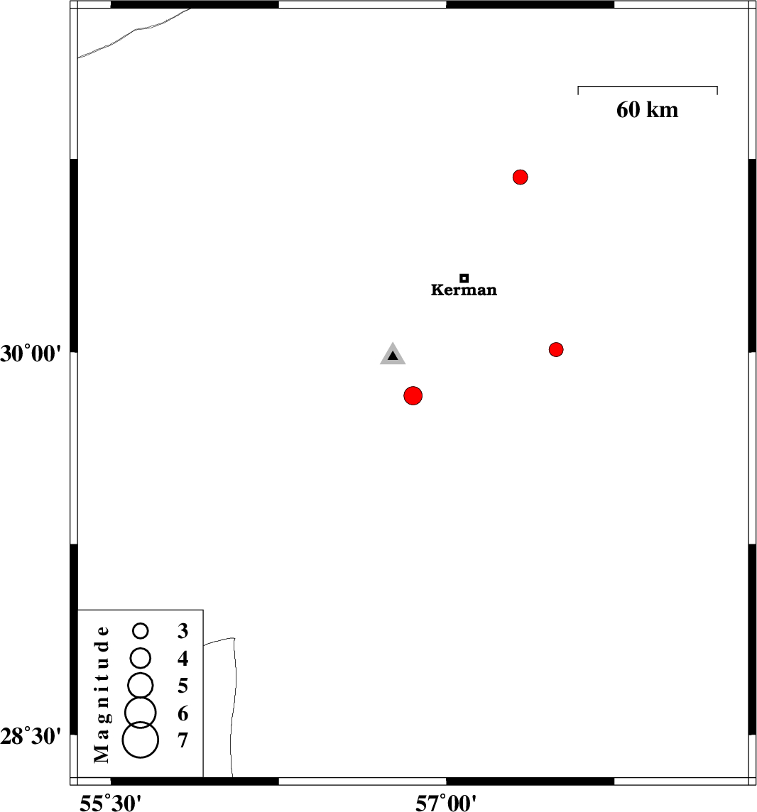 2009/04/04 | 22:34:26.3 | 03:04:26.3 | 30.68 | 57.33 | 18 | ML:2.9 | 49 km North-East of Kerman, Kerman Province |