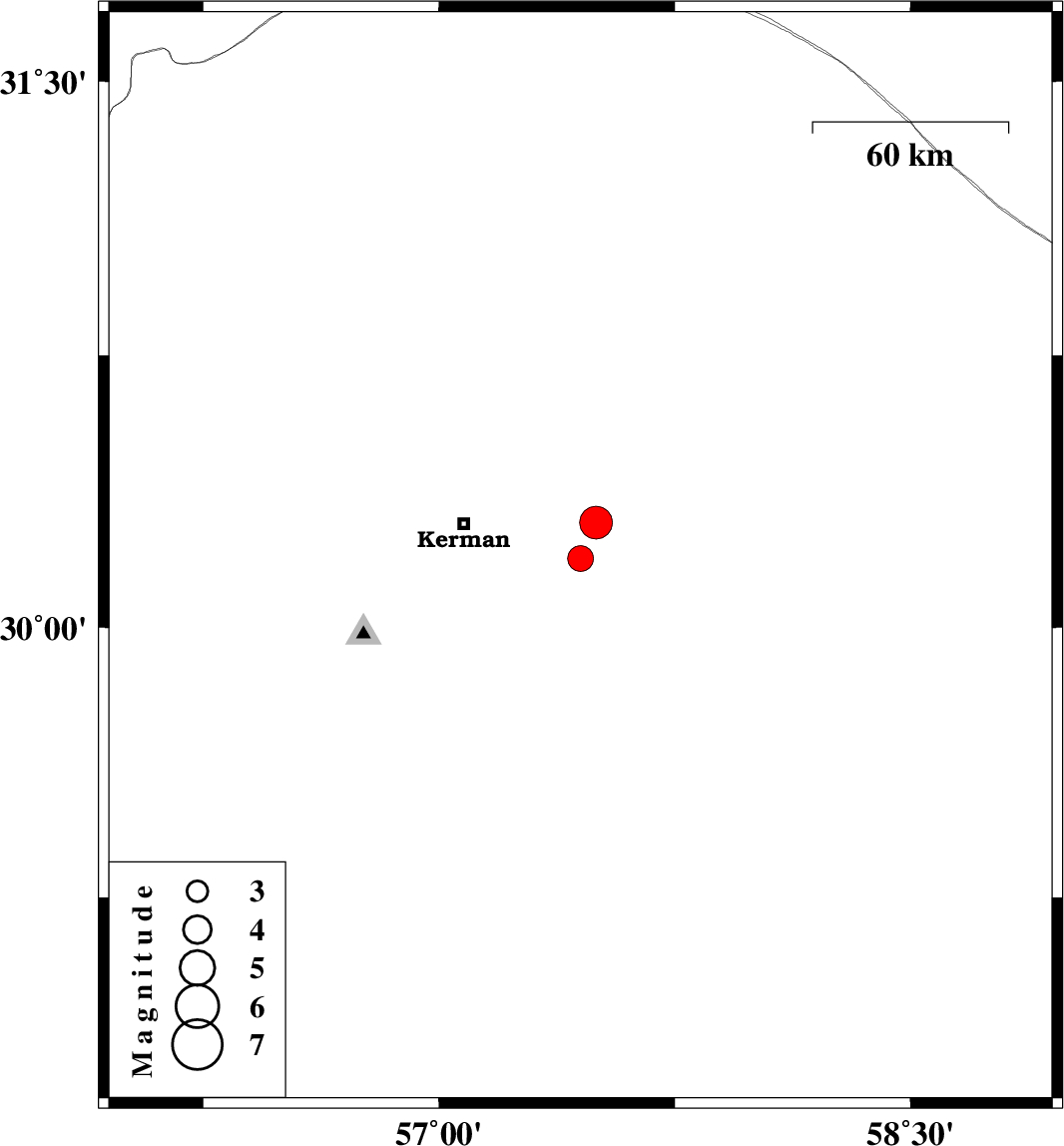 2009/05/11 | 02:14:05.1 | 06:44:05.1 | 30.29 | 57.5 | 18 | ML:4.7 | 40 km East of Kerman, Kerman Province |