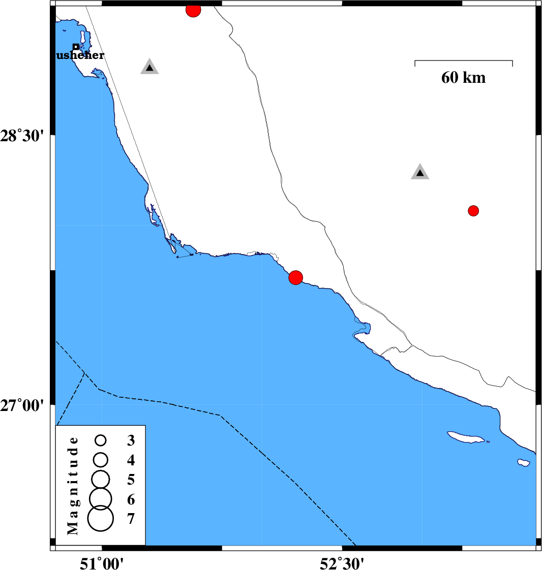 2009/05/17 | 01:05:11.2 | 05:35:11.2 | 27.71 | 52.21 | 17 | ML:3.9 | 17 km South-West of Jam, Bushehr Province | ||