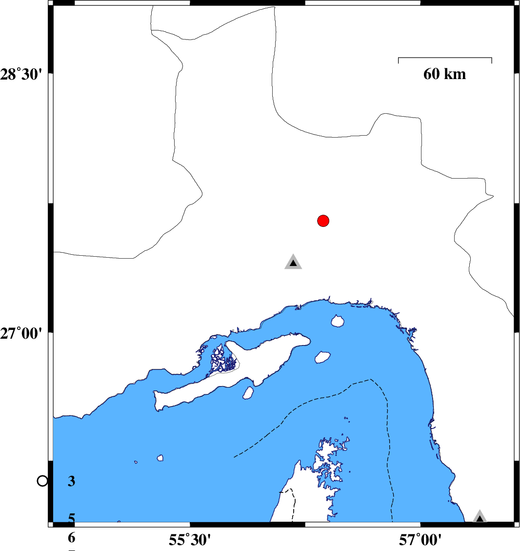 2009/06/01 | 04:50:10.7 | 09:20:10.7 | 27.39 | 56.11 | 6 | ML:3.4 | 29 km North-West of Bandar-e abbas, Hormozgan Province | ||