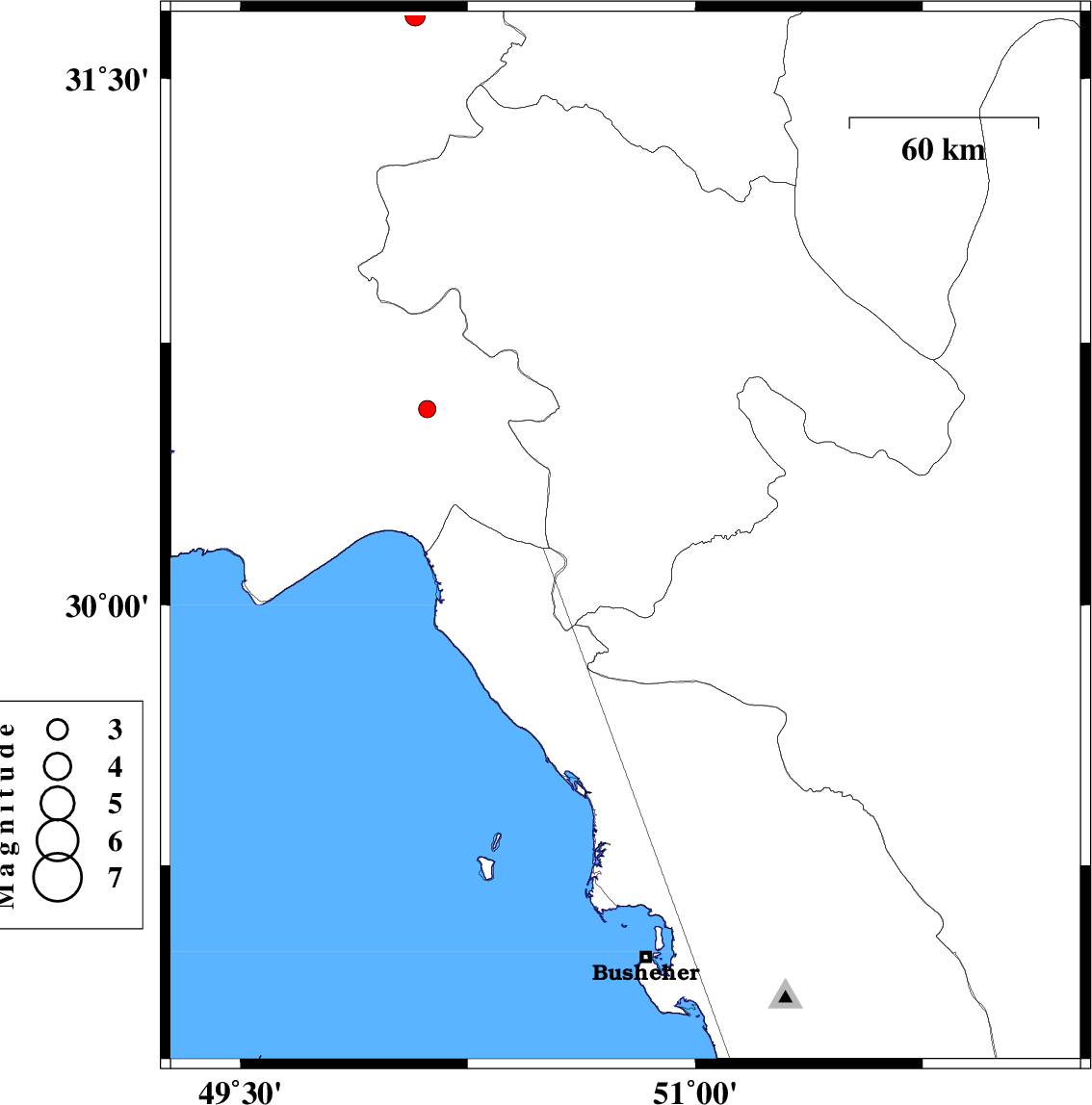 2009/06/04 | 00:25:40.6 | 04:55:40.6 | 30.19 | 50.77 | 5 | ML:2.6 | 18 km South of Dogonbadan, Kohkiluieh va boyerahmad Province | ||