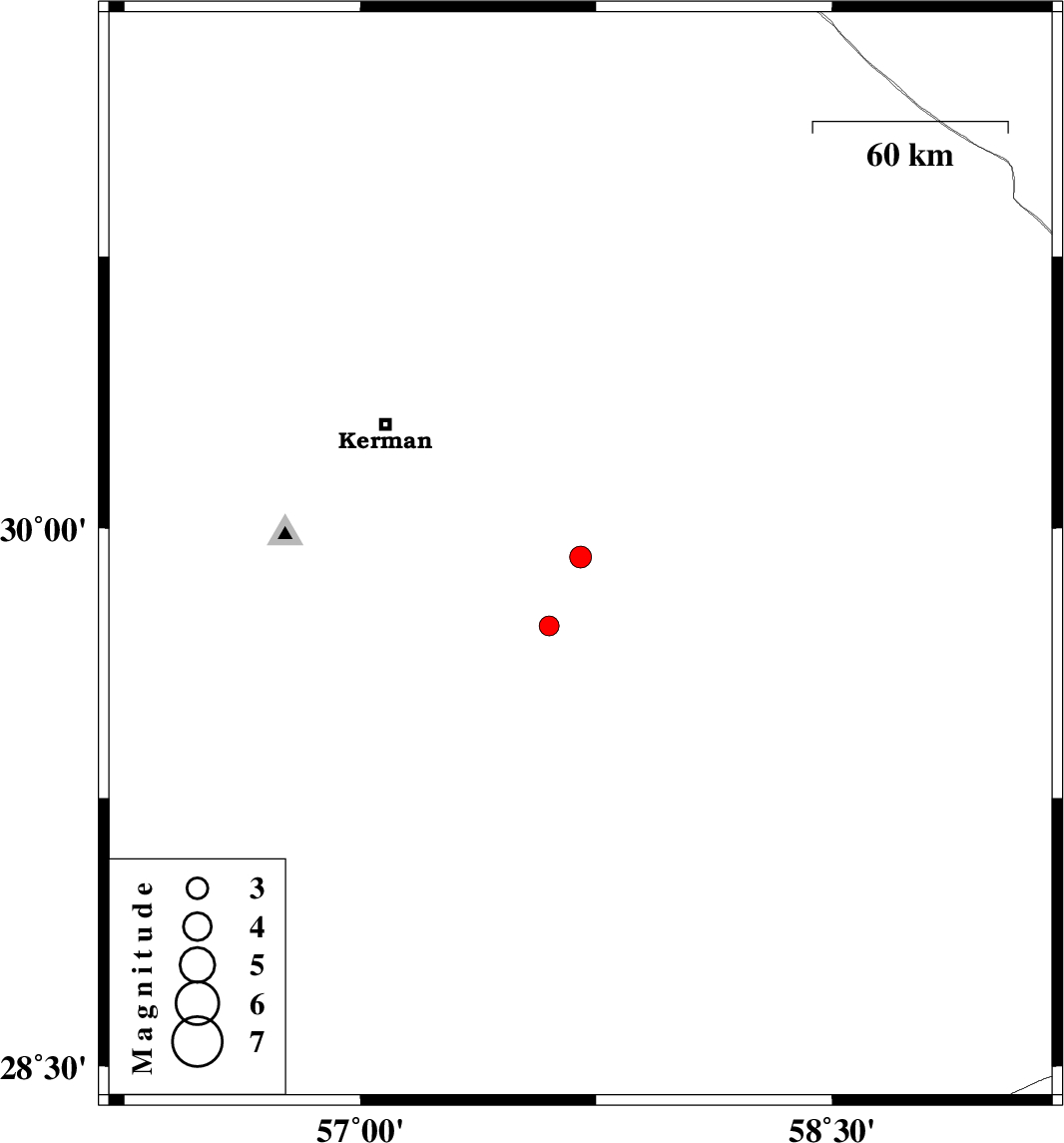 2009/06/05 | 13:20:26.5 | 17:50:26.5 | 29.92 | 57.7 | 14 | ML:3.1 | 72 km South-East of Kerman, Kerman Province | ||