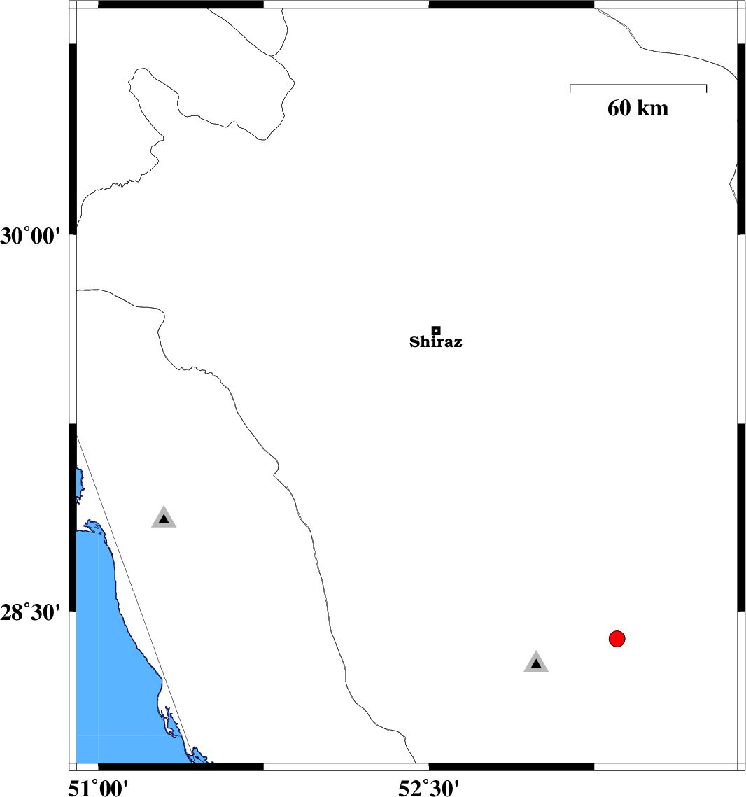 2009/06/09 | 19:32:29.7 | 00:02:29.7 | 29.39 | 52.4 | 15 | ML:3.3 | 28 km South-West of Shiraz, Fars Province | ||