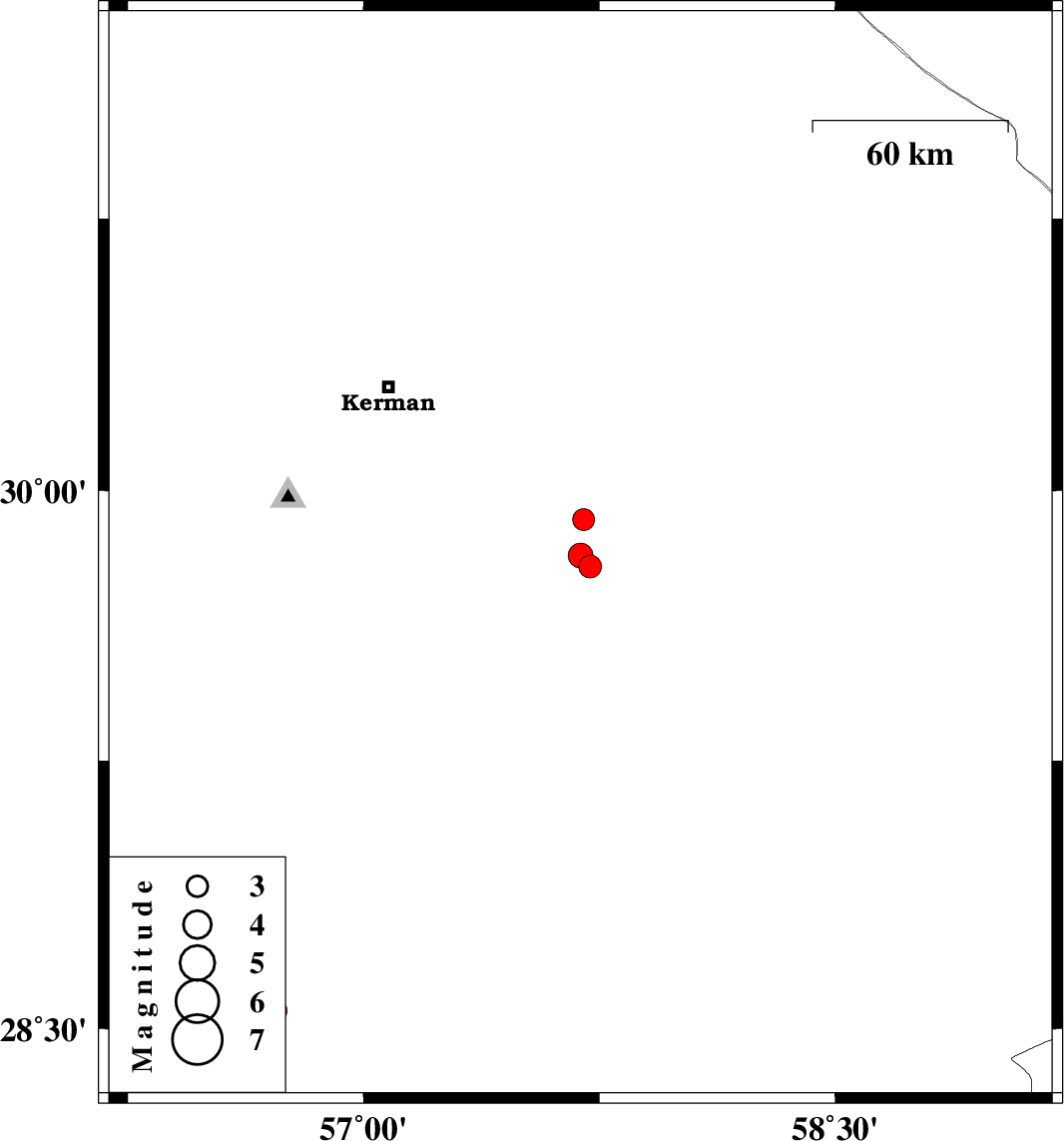 2009/06/05 | 13:20:26.5 | 17:50:26.5 | 29.92 | 57.7 | 14 | ML:3.1 | 72 km South-East of Kerman, Kerman Province |