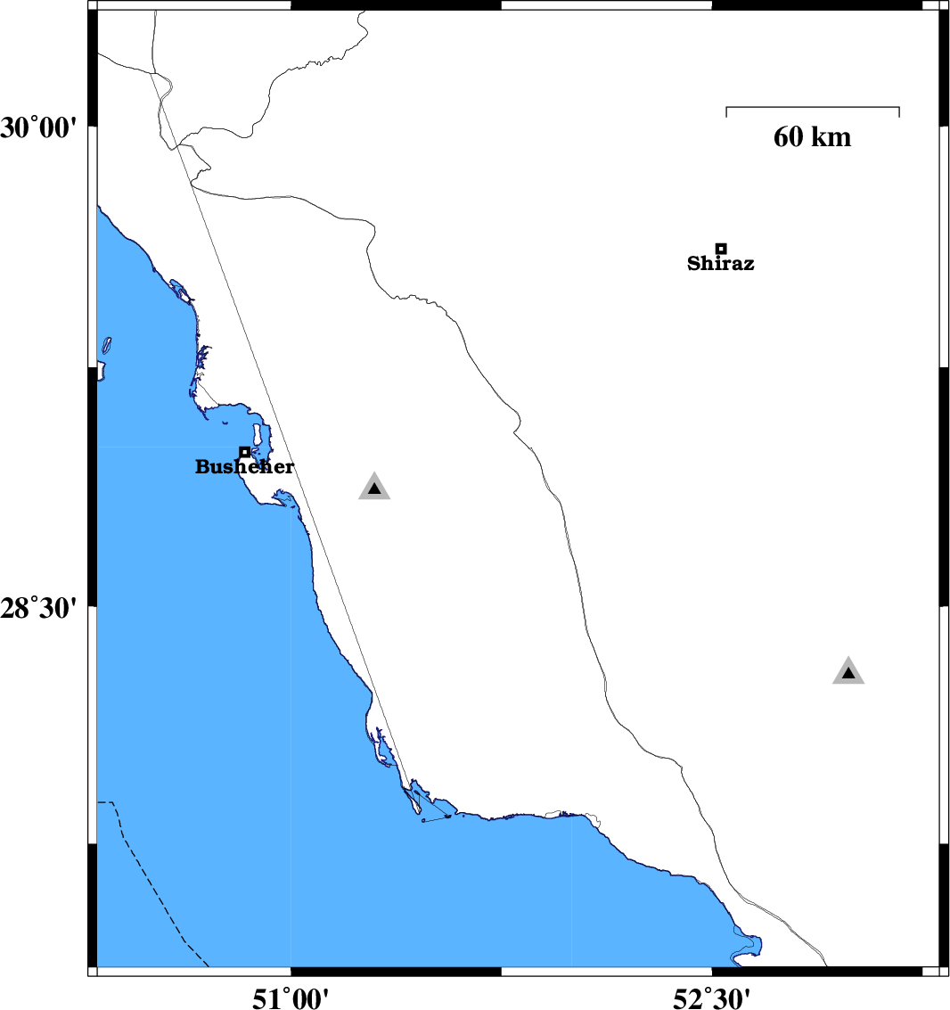 2009/06/09 | 19:32:29.7 | 00:02:29.7 | 29.39 | 52.4 | 15 | ML:3.3 | 28 km South-West of Shiraz, Fars Province | ||