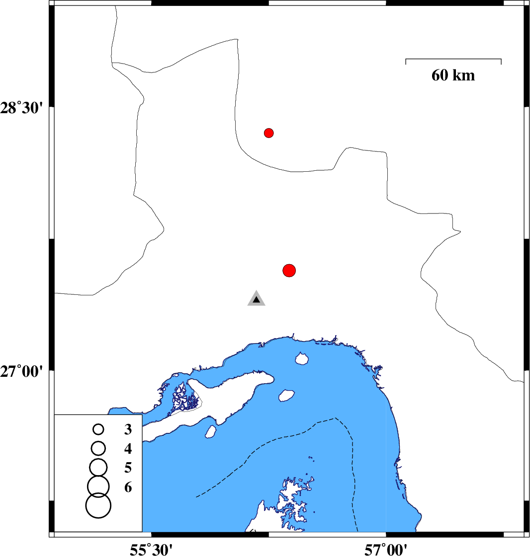 2009/06/17 | 09:10:15.5 | 13:40:15.5 | 26.52 | 55.06 | 18 | ML:3.2 | Persian Gulf, 21 km East of Bandar-e lengeh |