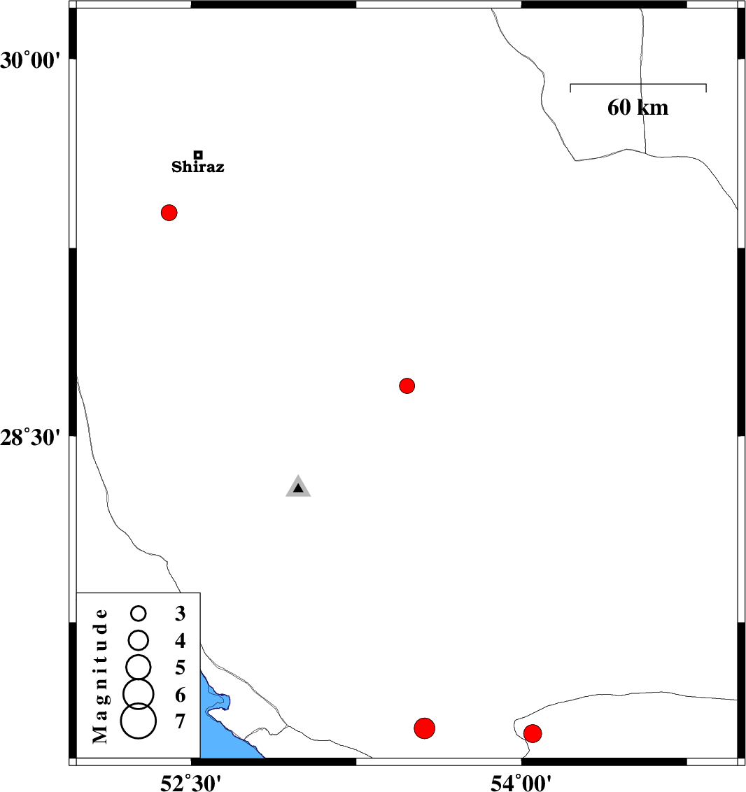 2009/06/09 | 19:32:29.7 | 00:02:29.7 | 29.39 | 52.4 | 15 | ML:3.3 | 28 km South-West of Shiraz, Fars Province | ||