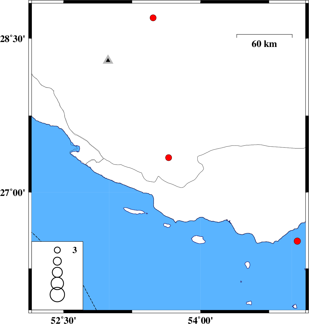 2009/06/17 | 09:10:15.5 | 13:40:15.5 | 26.52 | 55.06 | 18 | ML:3.2 | Persian Gulf, 21 km East of Bandar-e lengeh |
