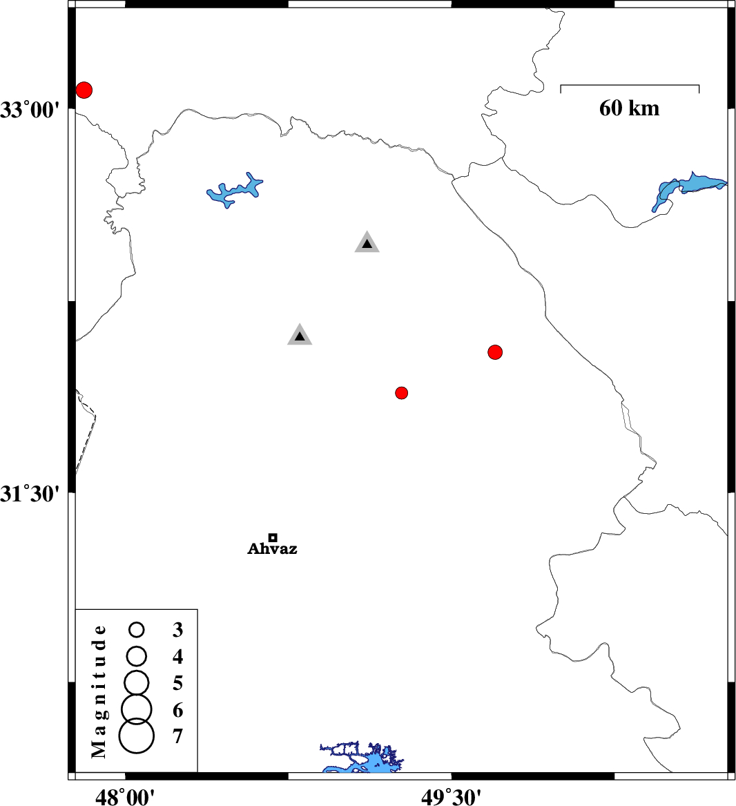 2009/06/30 | 09:36:40.0 | 14:06:40.0 | 31.89 | 49.27 | 14 | ML:2.6 | 5 km Masjed Soleyman, Khoozestan Province | ||