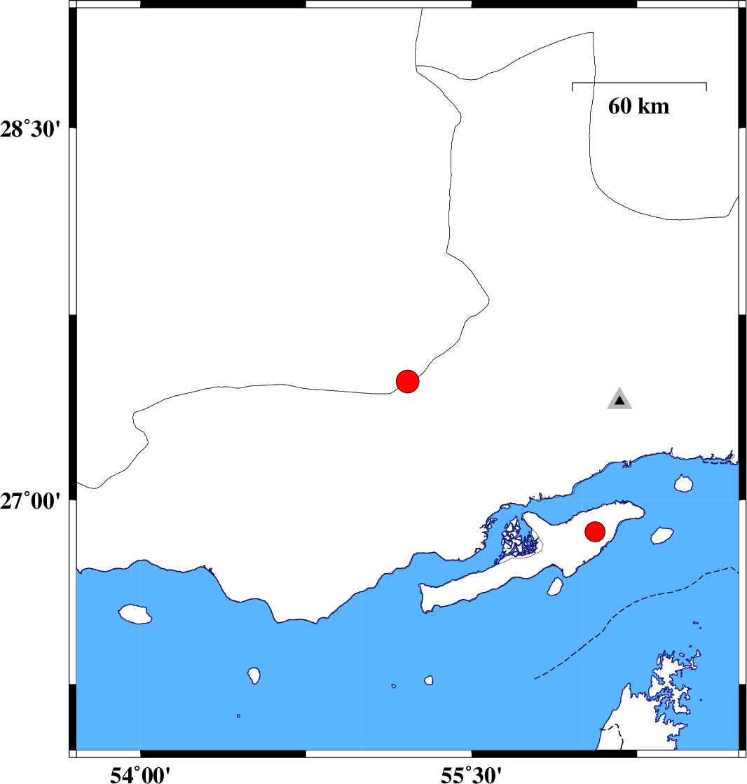 2009/12/23 | 16:51:53.2 | 20:21:53.2 | 26.87 | 56.06 | 0 | ML:4.1 | Persian Gulf, 23 km West of Qeshm |