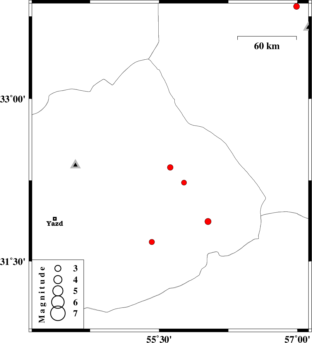 2010/01/11 | 00:16:52.2 | 03:46:52.2 | 31.87 | 56.03 | 14 | ML:3.1 | 66 km North-East of Bafq, Yazd Province | ||