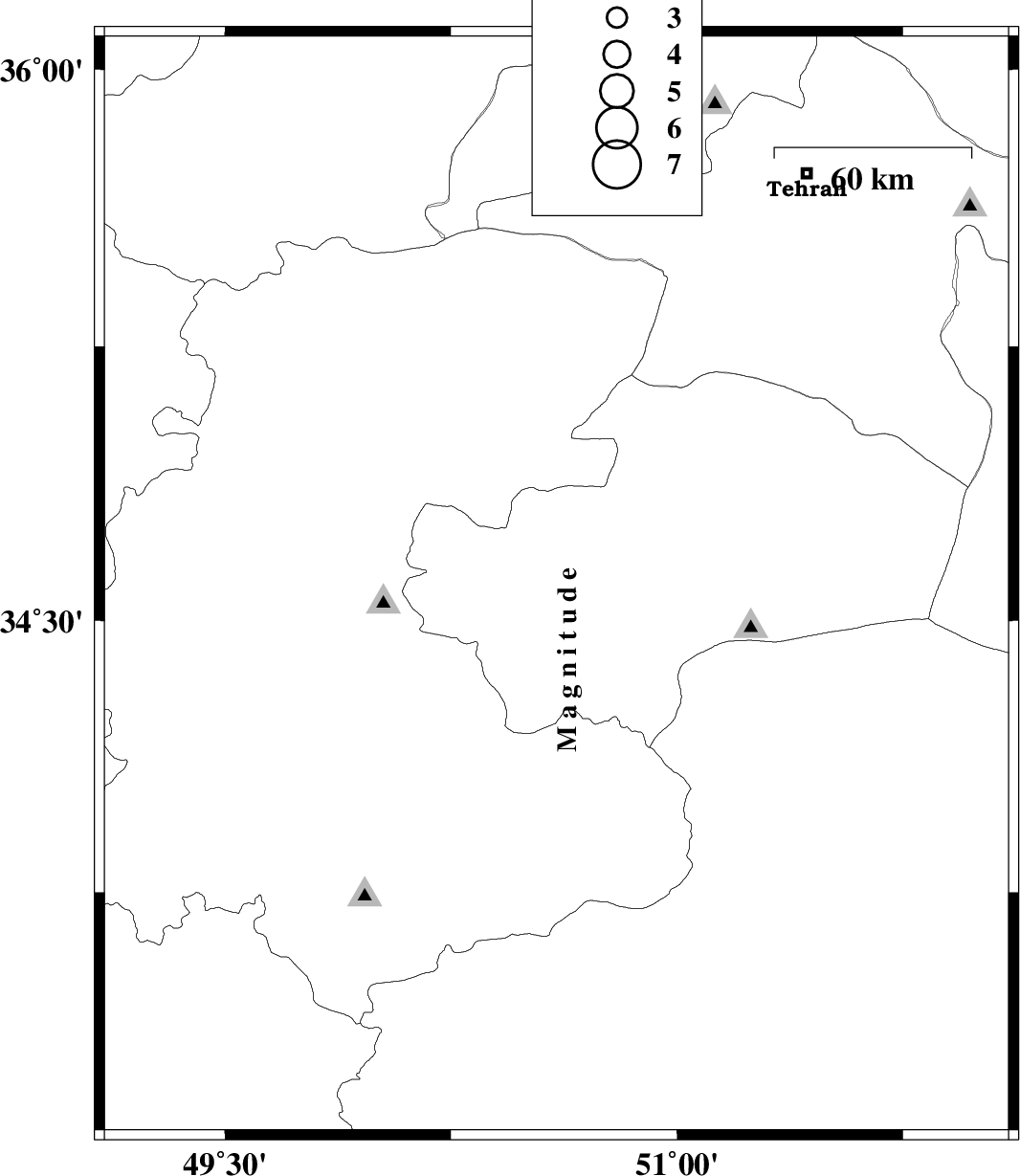 2010/01/16 | 05:48:06.5 | 09:18:06.5 | 34.5 | 51.33 | 6 | ML:2.6 | 45 km South-East of Qom, Qom Province | ||