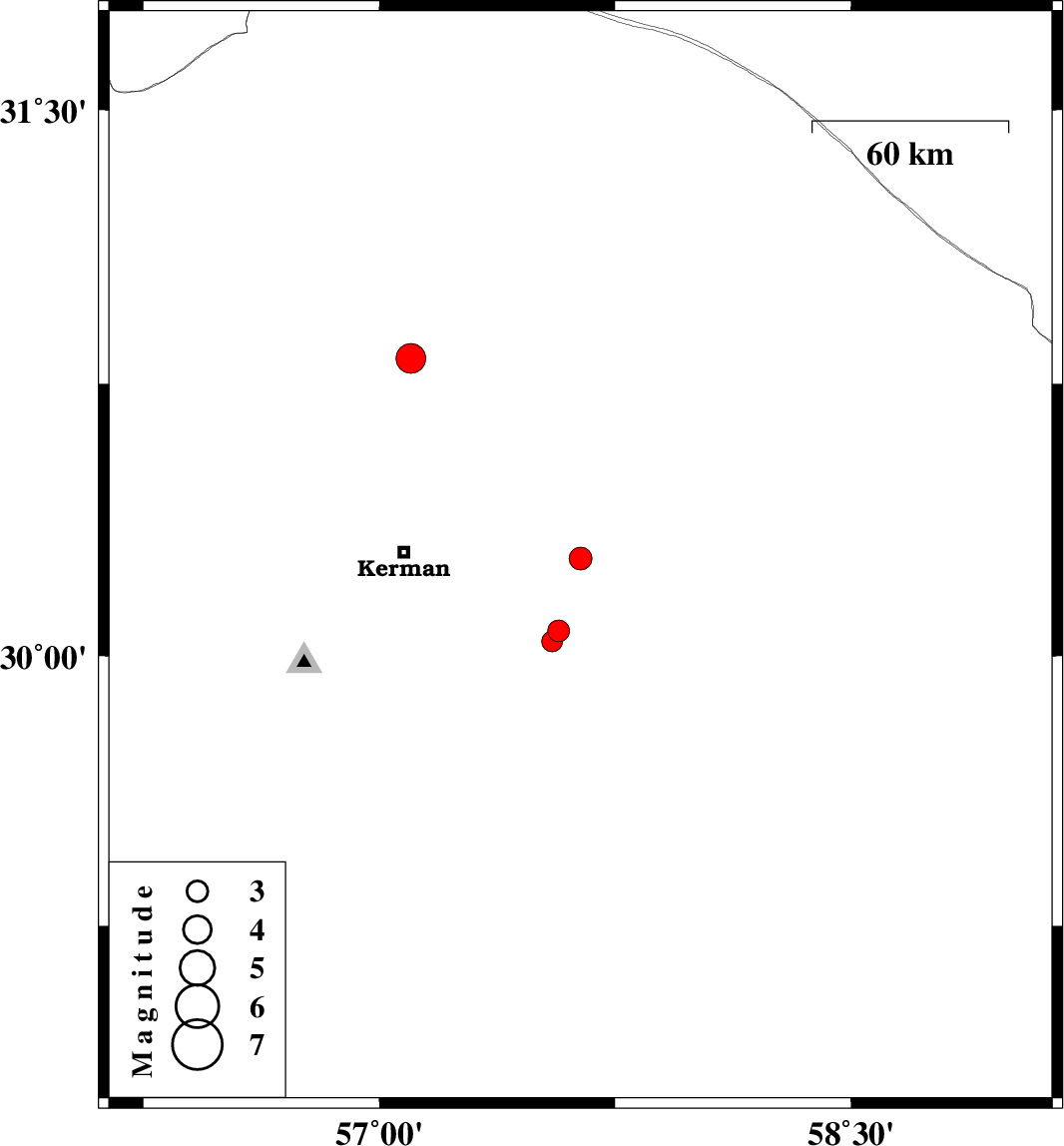 2010/02/07 | 07:55:01.0 | 11:25:01.0 | 30.04 | 57.55 | 6 | ML:3 | 52 km South-East of Kerman, Kerman Province | ||
