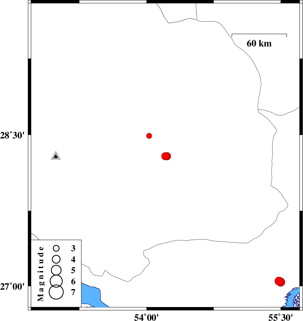 2010/01/14 | 14:55:10.3 | 18:25:10.3 | 28.49 | 54.03 | 14 | ML:2.7 | 45 km East of Jahrom, Fars Province | ||