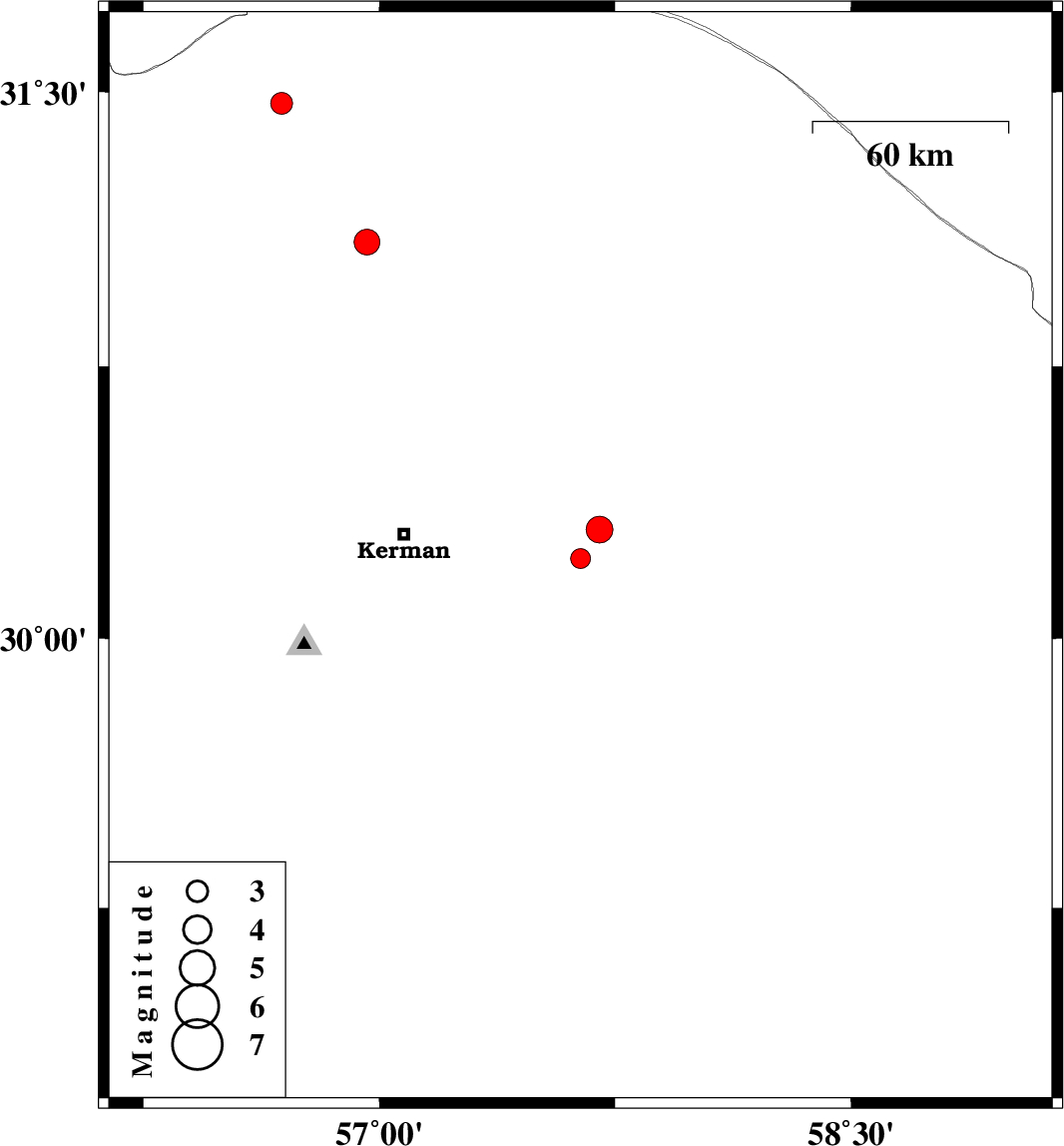 2010/03/08 | 16:39:35.2 | 20:09:35.2 | 30.3 | 57.7 | 14 | ML:3.8 | Kerman Province, 60 km East of Kerman | ||