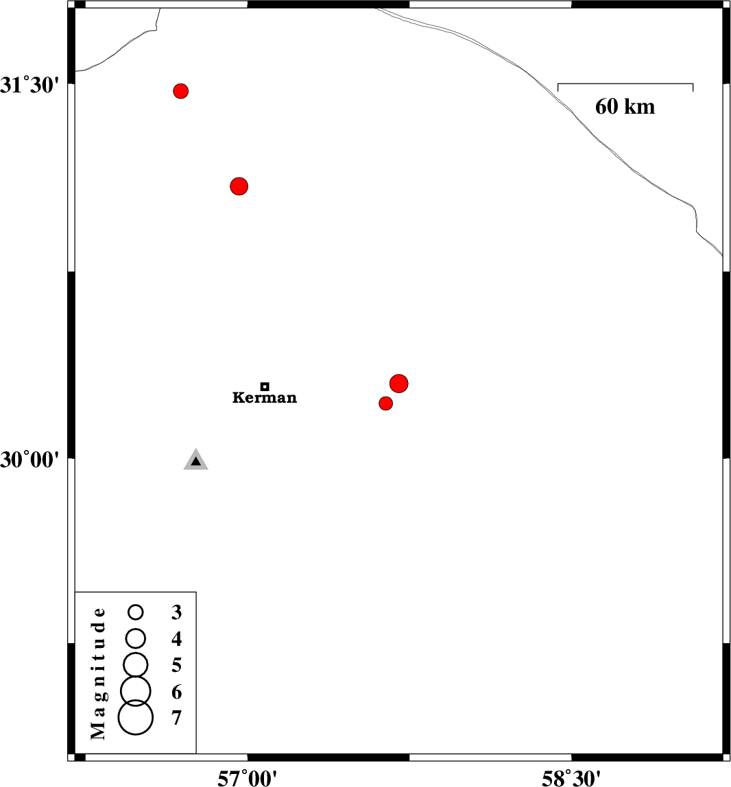 2010/03/08 | 16:39:35.2 | 20:09:35.2 | 30.3 | 57.7 | 14 | ML:3.8 | Kerman Province, 60 km East of Kerman | ||
