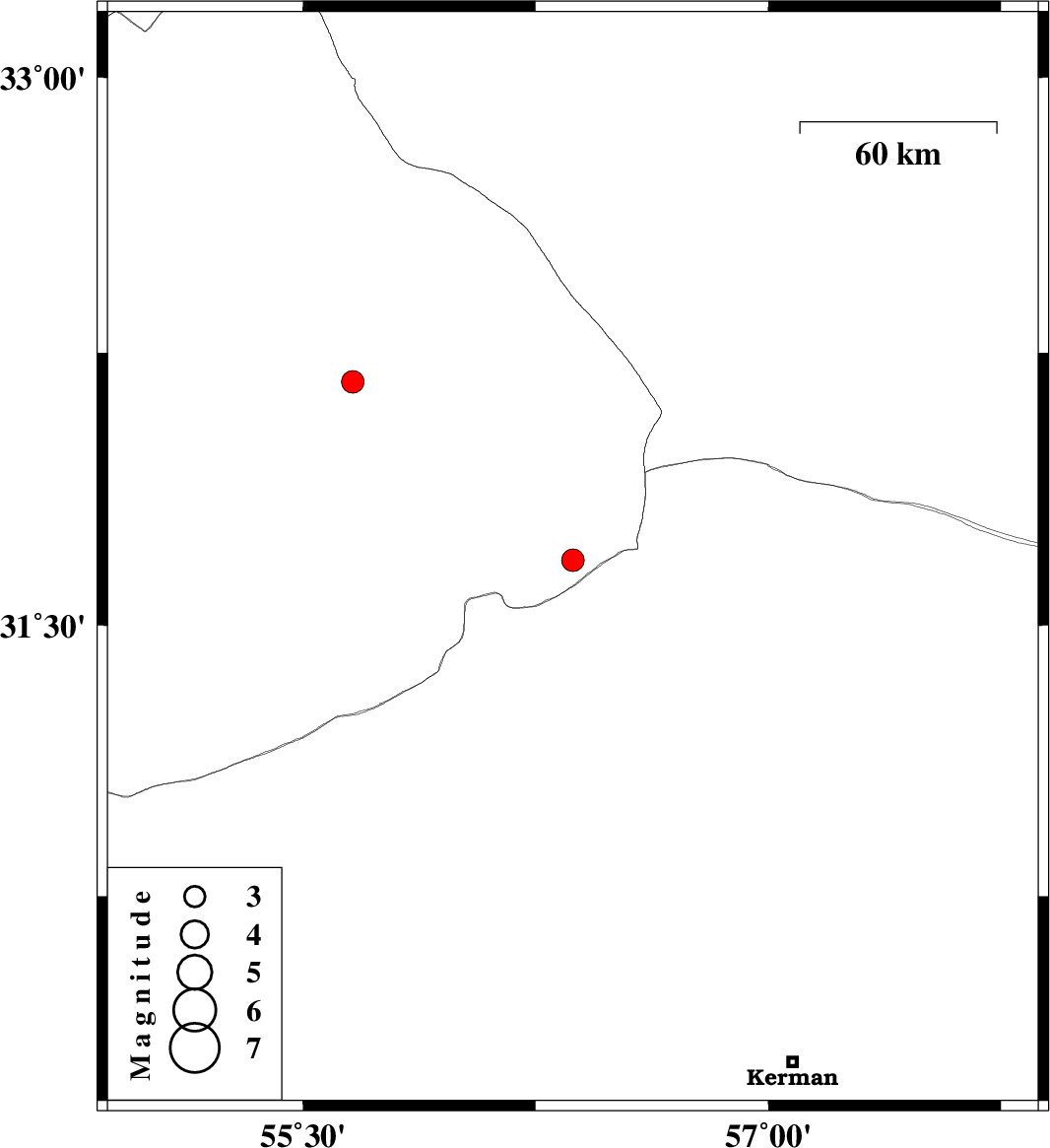 2010/03/18 | 15:09:57.6 | 18:39:57.6 | 32.17 | 55.66 | 14 | ML:3.2 | Yazd Province, 68 km North-East of Bafq |