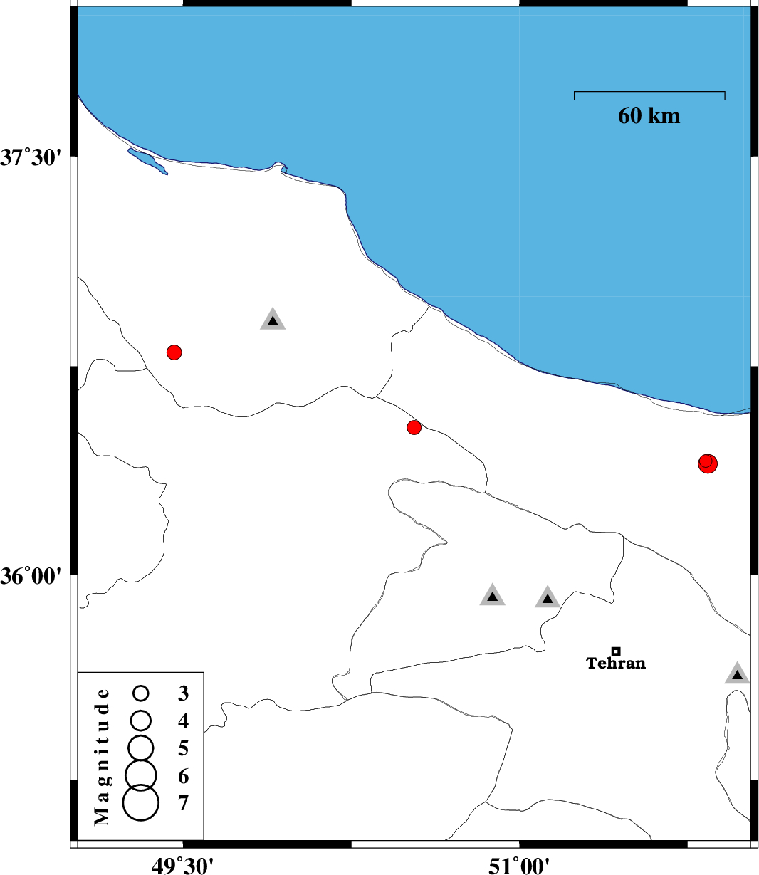 2010/03/09 | 03:22:14.6 | 06:52:14.6 | 36.4 | 51.84 | 6 | ML:3.8 | Mazandaran Province, 26 km South-West of Nur | ||