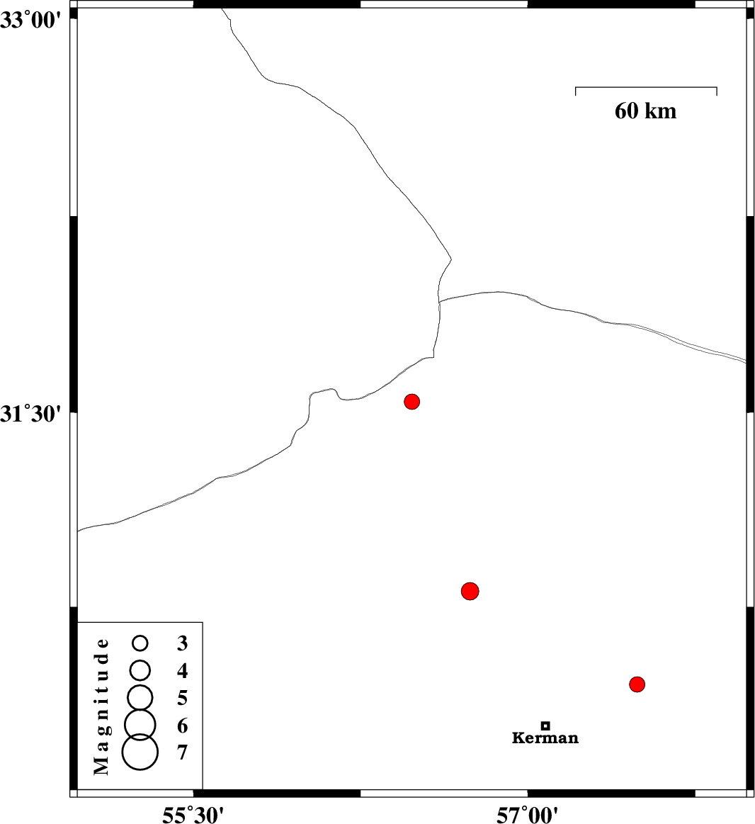2010/03/25 | 01:49:38.1 | 06:19:38.1 | 30.45 | 57.49 | 6 | ML:3.1 | Kerman Province, 43 km North-East of Kerman | ||