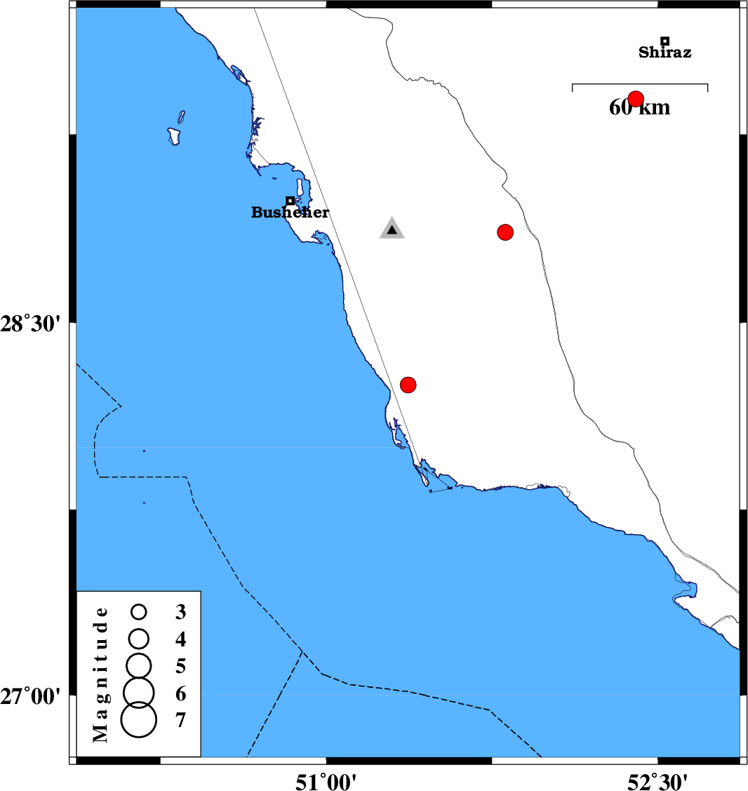 2009/07/04 | 06:02:52.8 | 10:32:52.8 | 28.25 | 51.37 | 43 | ML:3.3 | Bushehr Province, 45 km South of Khormog | ||