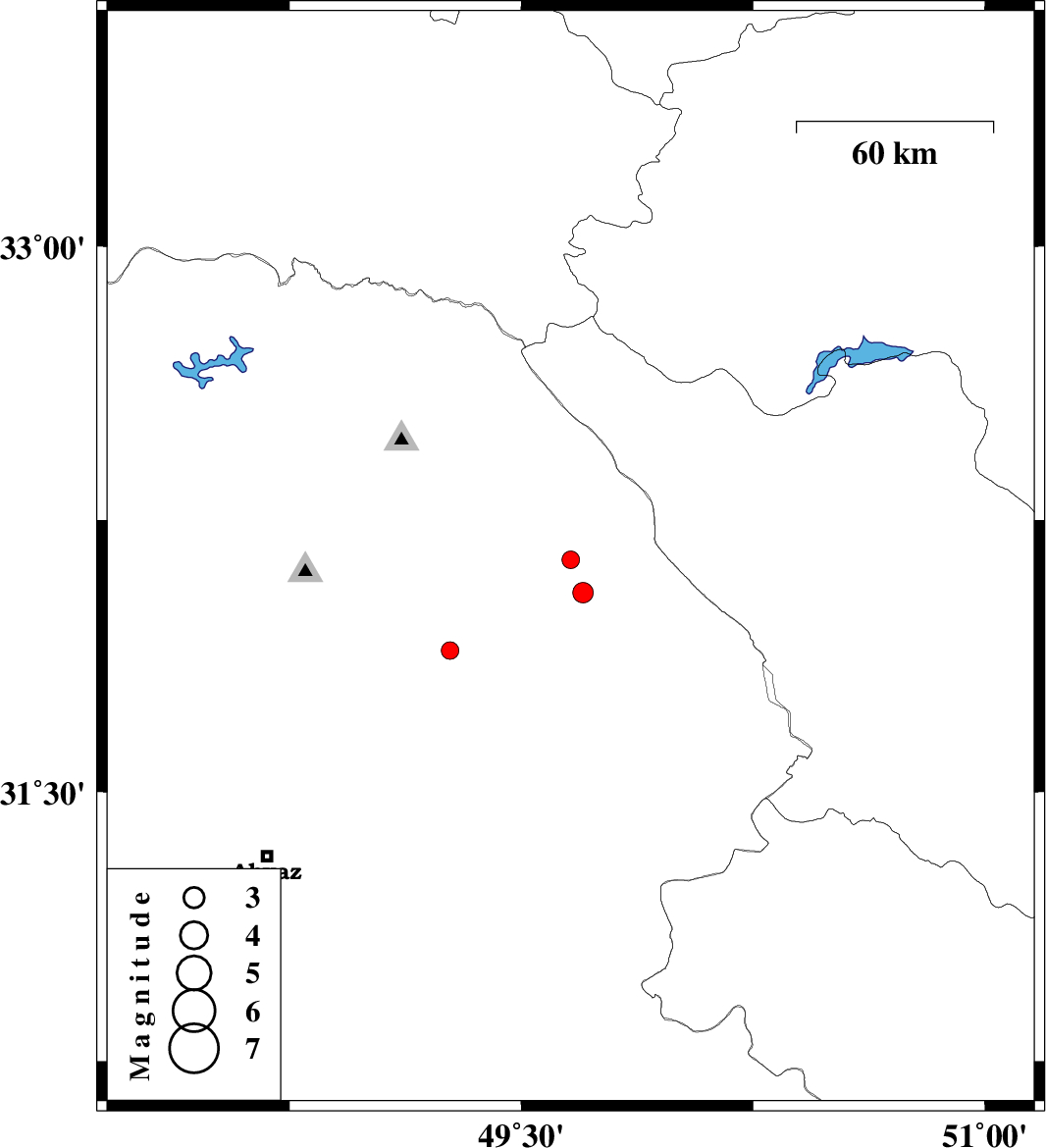2009/06/30 | 17:21:37.3 | 21:51:37.3 | 32.05 | 49.7 | 14 | ML:3 | 28 km North-West of Izeh, Khoozestan Province | ||