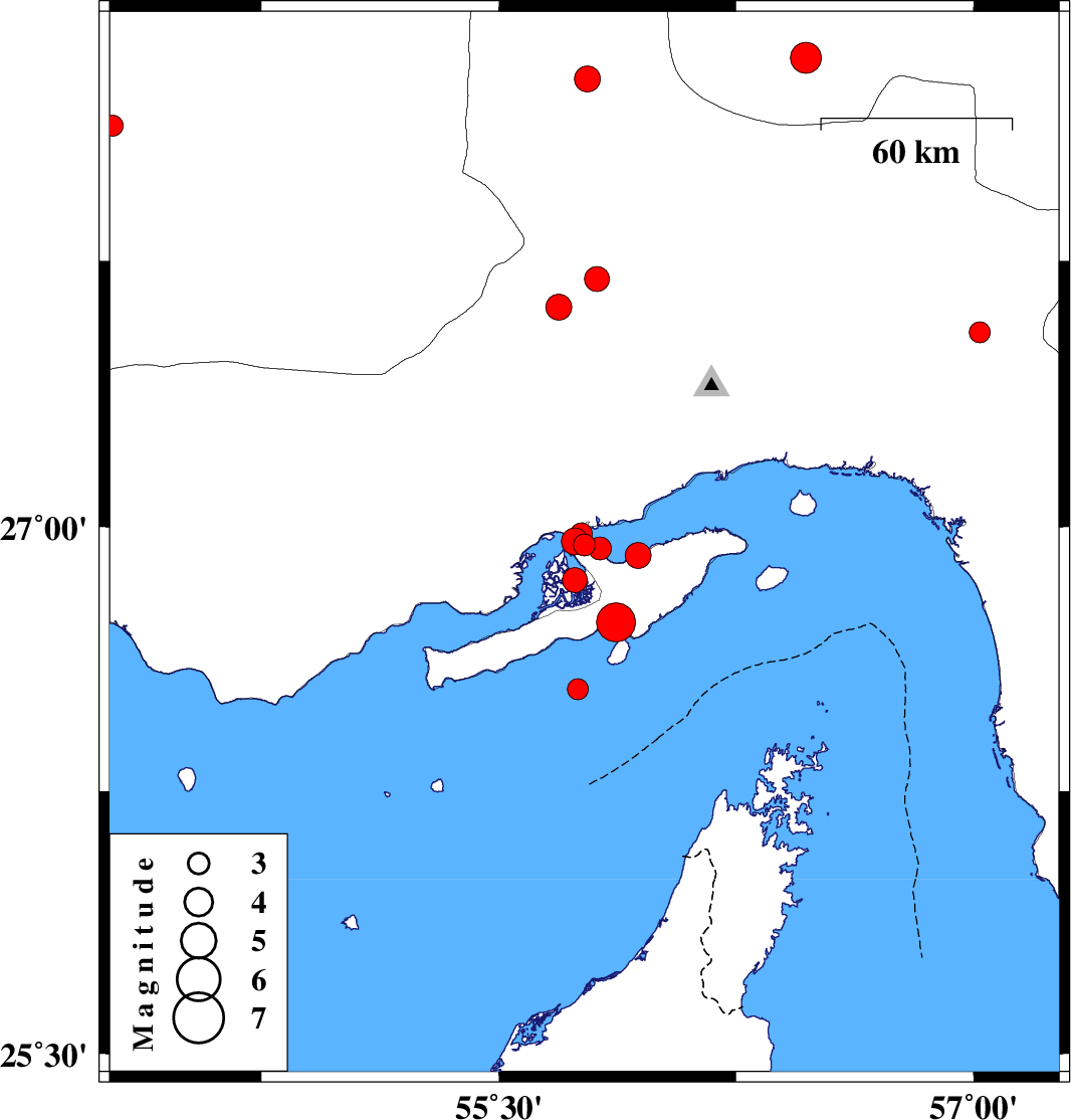 2009/07/22 05:20:49.8 09:50:49.8 26.5455.757 ML:3 Persian Gulf, 90 km East of Bandar-e lengeh