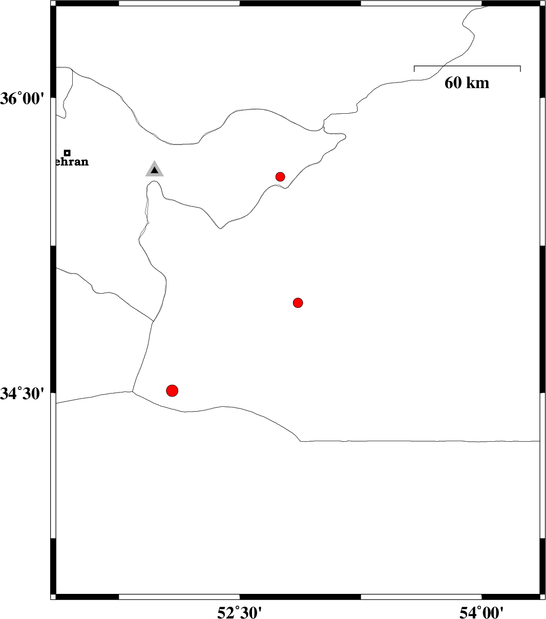 2009/08/05 | 08:02:26.6 | 12:32:26.6 | 34.96 | 52.86 | 27 | ML:2.7 | Semnan Province, 55 km South-East of Garmsar | ||