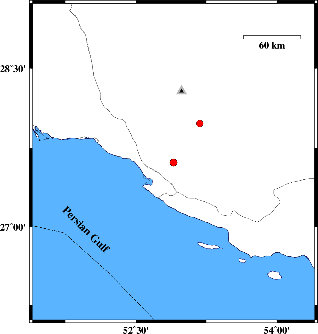 2009/08/08 | 08:06:51.8 | 12:36:51.8 | 27.98 | 53.18 | 24 | ML:3.3 | Fars Province, 56 km South-East of Qir va Karzin | ||